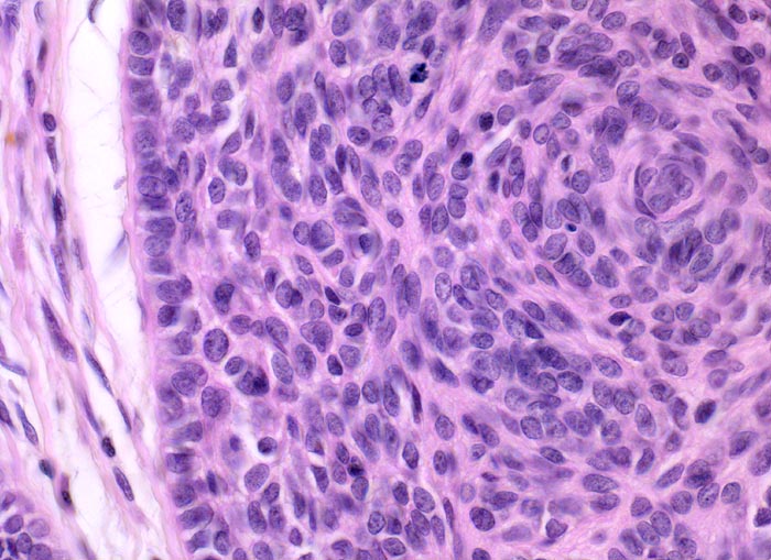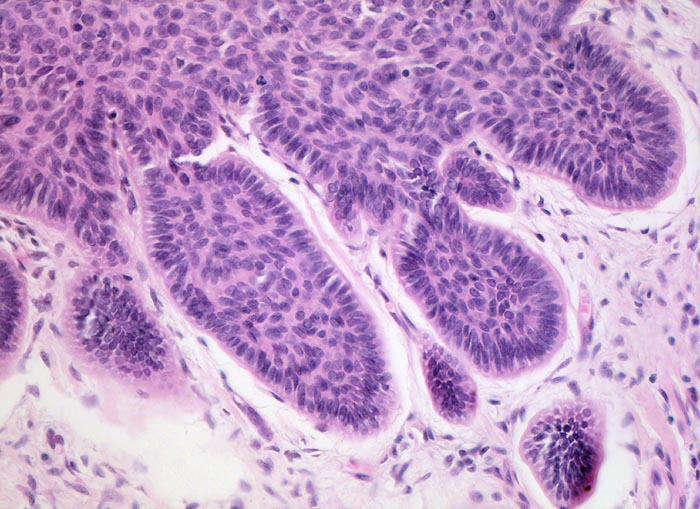• Die zytoplasmaarmen Tumorzellen ähneln Basalzellen der Epidermis.