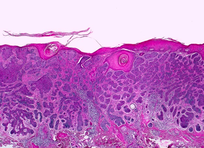 Die histomorphologische Variationsbreite ist gross. Häufig sind solide und oberflächliche Basalzellkarzinome. Gelegentlich beobachtet man Herde mit zystischer Degeneration, Ausbildung pseudoglandulärer Strukturen (> 3947), Pigmentierung oder herdförmige Verhornung (> 3951). Besonders rezidivfreudig sind der mikronoduläre (> 9738) und der infiltrative bzw. infiltrativ-sklerodermiforme Subtyp (> 7680). Beim diskontinuierlich wachsenden oberflächlichen Subtyp kann es für den Pathologen gelegentlich unmöglich sein, anzugeben, ob der Tumor in toto exzidiert wurde.
