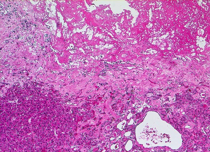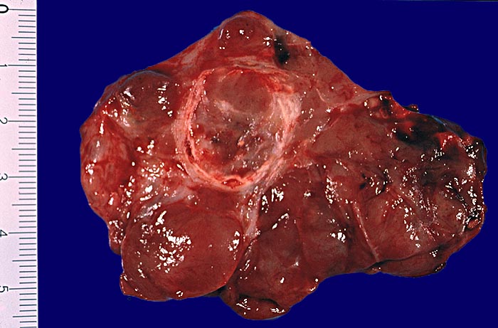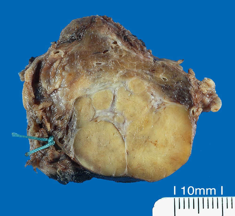 • Kapseldurchbrüche: Die breite bindegewebige Kapsel wird an mehreren Stellen pilzförmig vorgewölbt und an einigen Orten vollständig durchbrochen.