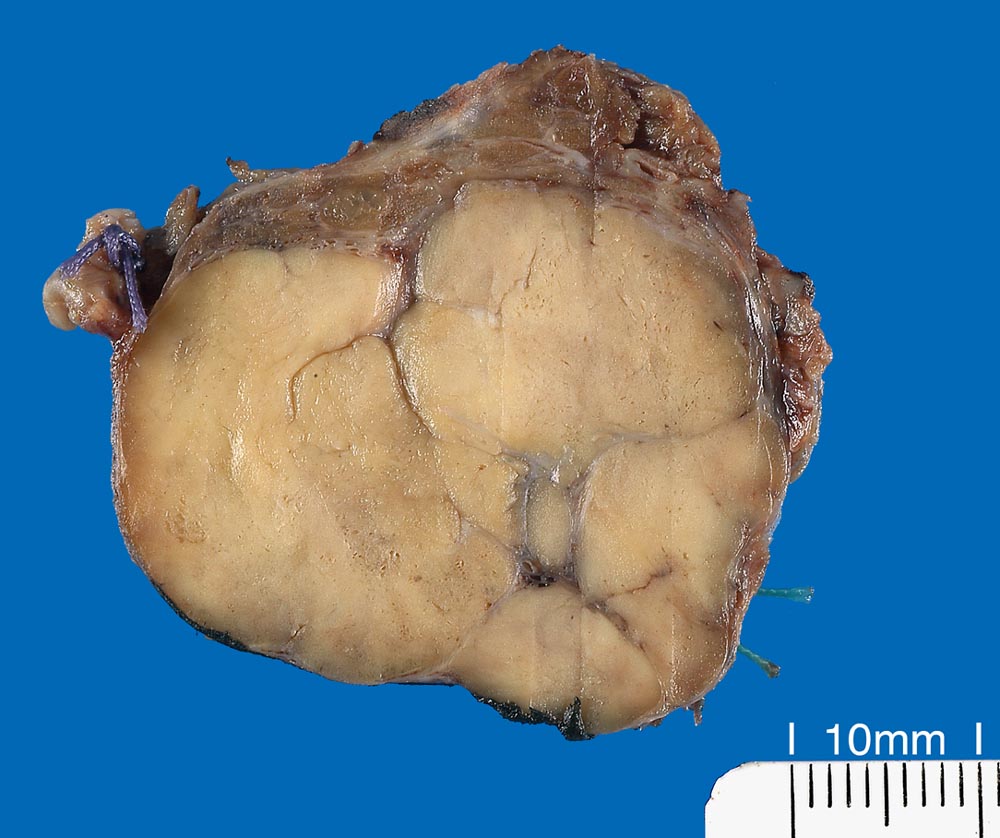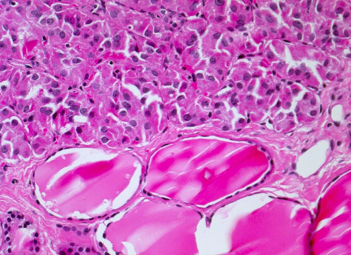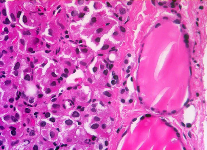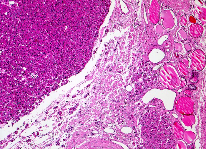 Lymphgefässeinbrüche oder Lymphknotenmetastasen gibt es im Gegensatz zum papillären Schilddrüsenkarzinom bei follikulären Karzinomen praktisch nie. Grob-invasive Karzinome (> 8137) (> 8286) (> 8267) stellen sich bereits makroskopisch als grosse, grau-weiße Tumoren mit unscharfer Begrenzung dar und/oder weisen mikroskopisch sehr ausgedehnte Kapseldurchbrüche und Gefässeinbrüche auf. Unter diagnostischen und therapeutischen Aspekten ebenfalls wichtig ist der Tumorzelltyp, da sowohl Hürthlezell-Karzinome (> 3036) wie auch hellzellige Karzinome beziehungsweise deren gleichartig differenzierte Metastasen keine oder nur eine deutlich reduzierte Radiojodspeicherung aufweisen. Die Diagnose "follikuläres Schilddrüsenkarzinom" ist eine Ausschlussdiagnose (DD: follikuläres Adenom, papilläres Karzinom vom follikulären Subtyp). Differenzierte papilläre und follikuläre Schilddrüsenkarzinome werden nicht gegradet.