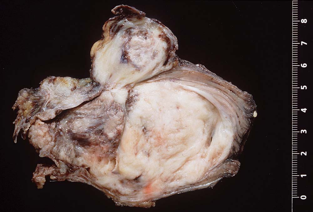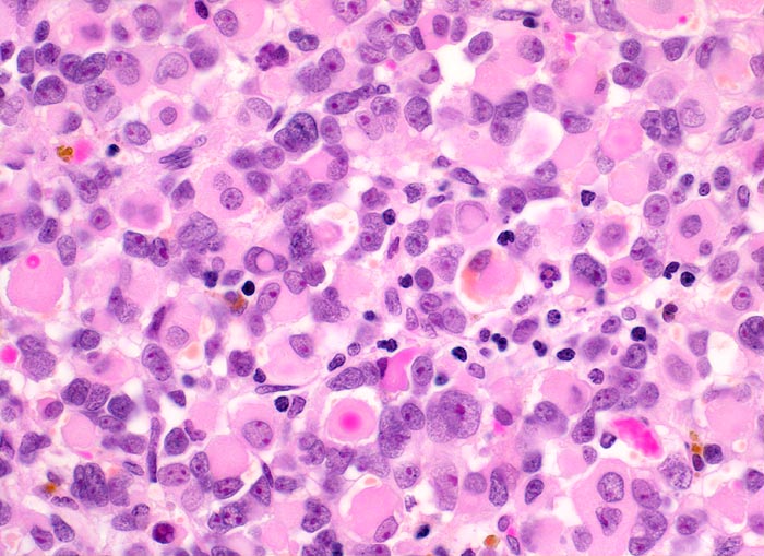 Das makroskopische Bild ist uncharakteristisch und variiert in Abhängigkeit von der Lokalisation. Fokale Nekrosen und zystische Degeneration sind häufig. Es werden verschiedene histologische Subtypen unterschieden, welche charakteristische molekulargenetische Aberrationen aufweisen und mit unterschiedlichen Prognosen assoziiert sind. Die beste Prognose haben botryoide und spindelzellige Rhabdomyosarkome gefolgt von embryonalen Rhabdomyosarkomen (intermediäre Prognose) und alveolären bzw. pleomorphen Rhabdomyosarkomen (schlechteste Prognose). Therapieantwort und Prognose hängen neben der Histologie auch von der Lokalisation ab. Embryonale Rhabdomyosarkome zeigen ein breites morphologisches Spektrum. Dieses reicht von wenig differenzierten Tumoren, die nur mittels Immunhistochemie und Elektronenmikroskopie diagnostizierbar sind zu gut differenzierten Tumoren, die fetaler Muskulatur ähneln. Oft findet sich eine Mischung von wenig differenzierten kleinen, runden und/oder spindeligen Zellen und eine variable Anzahl differenzierter Rhabdomyoblasten mit reichlich eosinophilem Zytoplasma. Die Rhabdomyoblasten können rund, spindelig, kaulquappenförmig oder spinnwebenförmig sein. Besser differenzierte Zellen enthalten reichlich Zytoplasma mit Querstreifung, welche allerdings teilweise nur elektronenmikroskopisch nachweisbar ist.