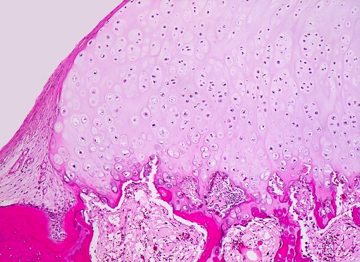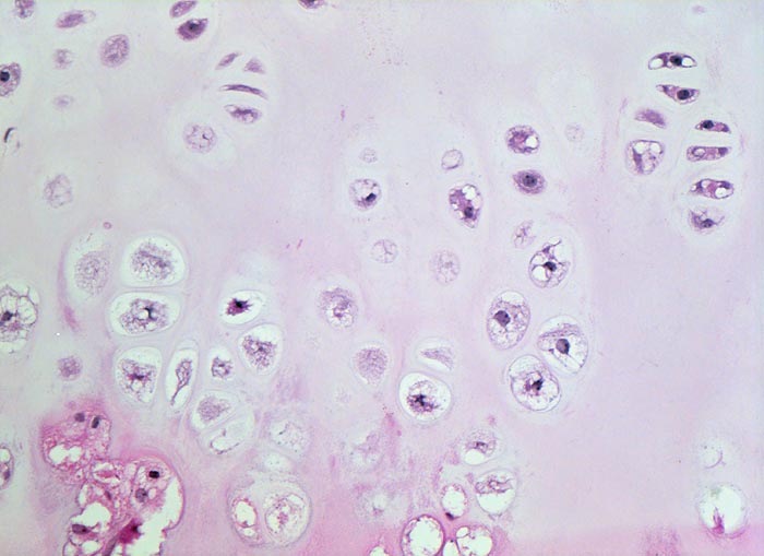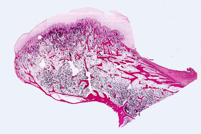 Morphologie: Osteochondrome sind breitbasig dem Knochen aufsitzende oder gestielte knöcherne Tumoren, die von einer 1-6mm dicken Kappe aus hyalinem Knorpel bedeckt werden. Zwischen Knorpel und Knochen liegt eine Zone enchondraler Ossifikation, die der normalen Wachstumsfuge ähnelt und den Ausgangspunkt für die Grössenzunahme des Tumors bei noch nicht abgeschlossenem Skelettwachstum darstellt. Der hyaline Knorpel wirkt etwas unorganisiert und ist bedeckt von einer dünnen Schicht Perichondrium.