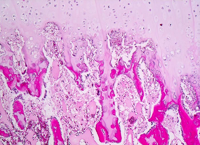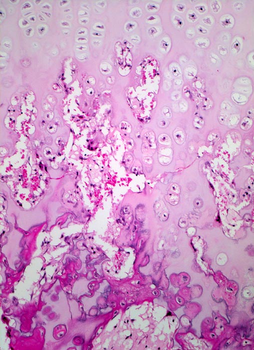 Übergang des Knorpels in enchondrale Ossifikationszone wie in einer Epiphysenfuge: Knochen wird abgelagert entlang von linearen Knorpelsäulen.