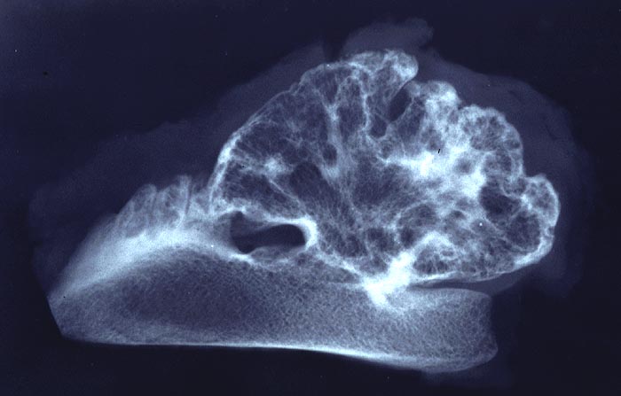 Diagnostik: Im konventionellen Röntgenbild lassen sich gestielte und breitbasige Osteochondrome unterscheiden, wobei letztgenannte Formen immer vom Gelenk weggerichtet sind. Ein wichtiges Charakteristikum ist, dass die Spongiosa des Osteochondroms mit der Spongiosa des ortsständigen Knochens in Verbindung steht und die Läsion nicht einfach nur der Kompakta aufsitzt. Die Knorpelkappe ist im konventionellen Röntgenbild ( 5033) nur angedeutet erkennbar, kann aber im CT, MRI oder im Ultraschall dargestellt und ausgemessen werden. In der Mehrzahl der sporadischen aber v.a. der hereditären Osteochondrome lassen sich biallelische Inaktivierungen des EXT1 oder EXT2 Gens nachweisen, was die neoplastische Genese der Läsionen unterstreicht.