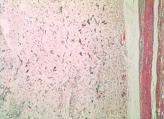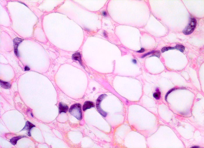 Die myxoiden Liposarkome sind histologisch durch Lipoblasten, ein Netzwerk feiner plexiformer Kapillaren (sog. chicken-wire Muster) und eine myxoide Matrix mit reichlich sauren Mucopolysacchariden gekennzeichnet. Die Zellularität spiegelt das biologische Verhalten wieder: hochdifferenzierte Tumoren sind hypozellulär. Am anderen Ende des morphologischen Spektrums steht das zelldichte rundzellige Liposarkom, das Ähnlichkeit mit einem klein-, blau- und rundzelligen Sarkom aufweist, sich aggressiv verhält und metastasieren kann. Für das Metastasierungsrisiko ist der Anteil der rundzelligen Komponente entscheidend (<5% = 23%, 5-10% = 35%, >25% = 58%).