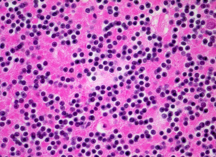 • Monomorpher Zellrasen mit hyperchromatischen ovalen oder karottenförmigen Zellkernen.
