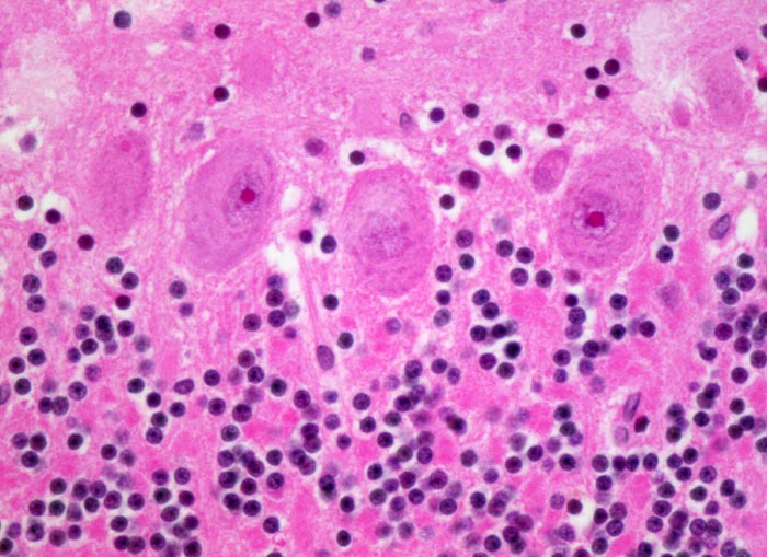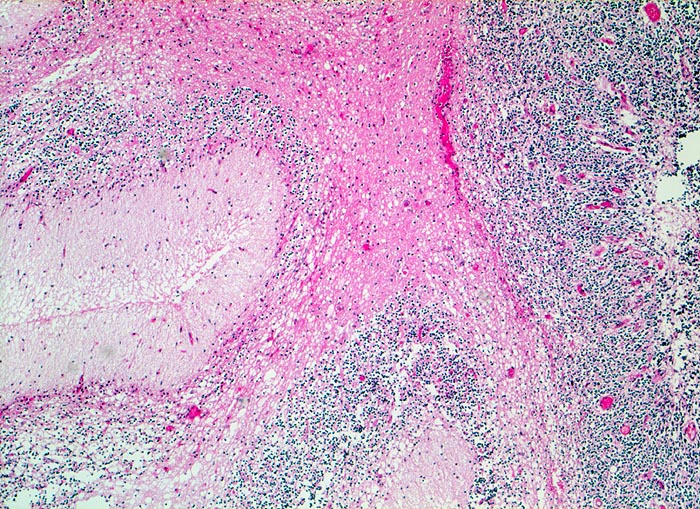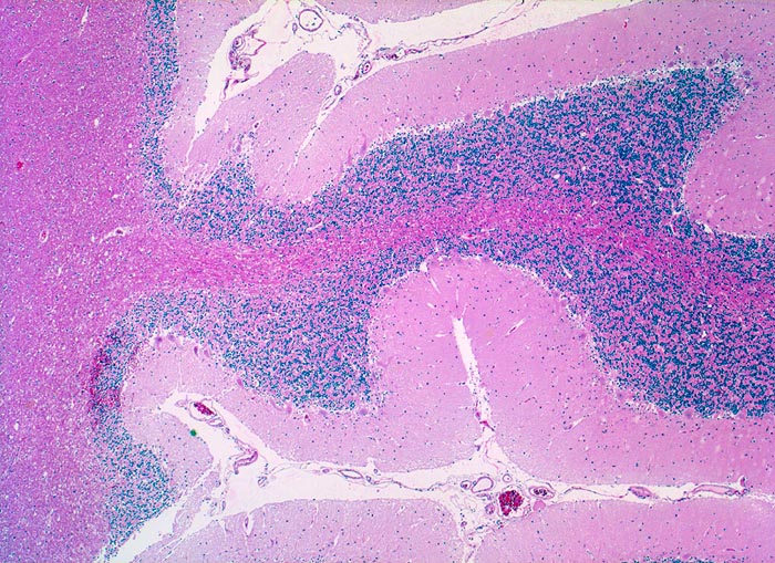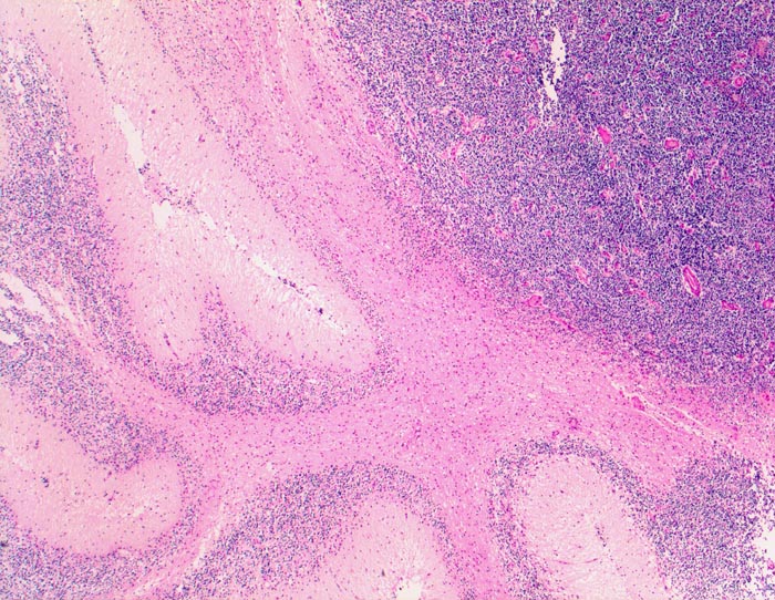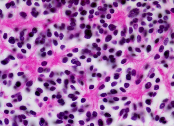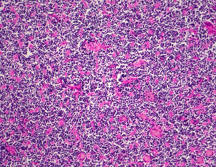 Wegen der hohen Zelldichte und der hohen Kern-Zytoplasmarelation erscheinen die Tumoren in der HE Färbung blau. Medulloblastome müssen differentialdiagnostisch von morphologisch ähnlichen kleinzelligen undifferenzierten Karzinomen und Lymphomen abgegrenzt werden. Das klassische Medulloblastom besteht aus dicht gepackten Zellen mit runden bis ovalen oder karottenförmigen stark hyperchromatischen Kernen umgeben von wenig Zytoplasma. Runde Zellen mit weniger dichtem Chromatin sind oft beigemischt. Zahlreiche Mitosen, flächenhafte Nekrosen und Apoptosen sind typisch. In weniger als einem Drittel der Fälle findet man die typischen Homer-Wright Rosetten. Diese bestehen aus ringförmig angeordneten Tumorzellkernen um ein fibrilläres Zentrum aus Zytoplasmafortsätzen.