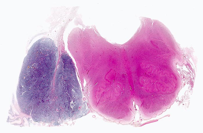 • Scharf begrenzter rundlicher sehr zellreicher (deshalb blauer) Tumor.