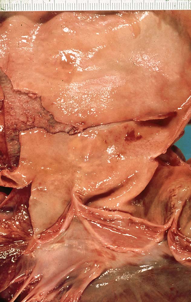 Die Media ist entzündungsfrei und zeigt keine strukturellen Störungen, insbesondere keine Vermehrung mukoider extrazellulärer Matrix, wie man es bei einem Marfansyndrom sehen würde.
