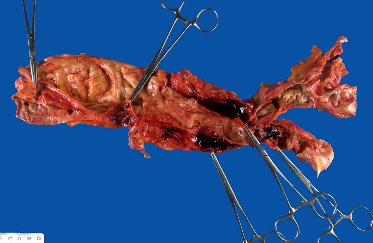 Der Intimaeinriss (auf dem Präparat nicht sichtbar) ist im Bereich einer ulzerierten atheromatösen Plaque erfolgt. update 10. September 2019