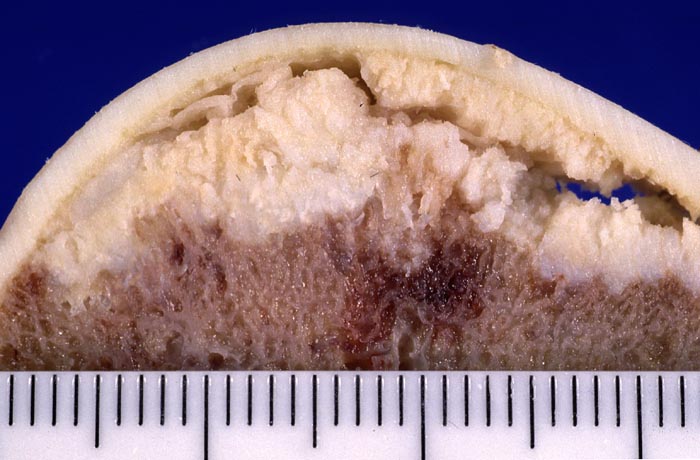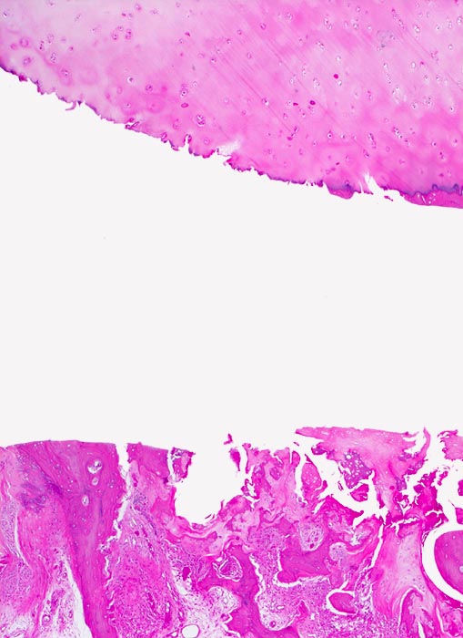 Makroskopisch ist die Nekrose im Anfangsstadium durch eine intensiv gelbe Verfärbung mit hämorrhagischem Randsaum charakterisiert. Häufig kommt es zur flächenhaften Ablösung des ansonsten intakten Gelenkknorpels (DD Arthrose!) zwischen subchondraler Knochenlamelle und angrenzender Spongiosa. In den Spätstadien sind die Nekrosezonen grau-gelb gefärbt und von körniger Konsistenz.