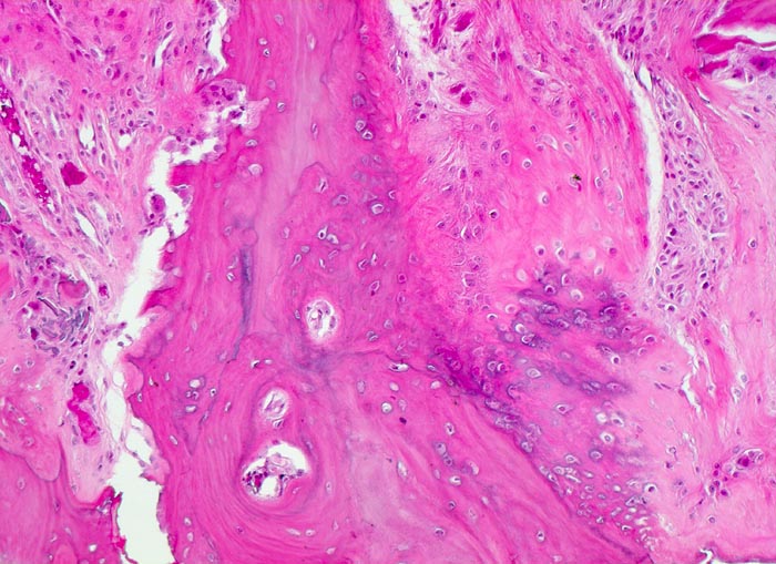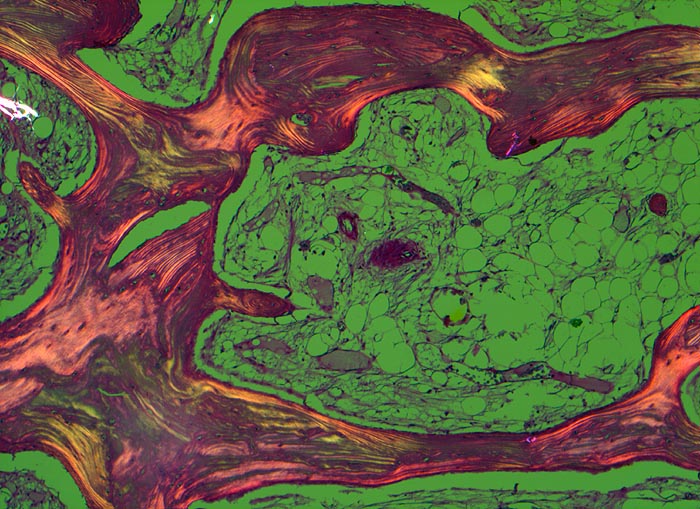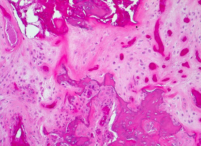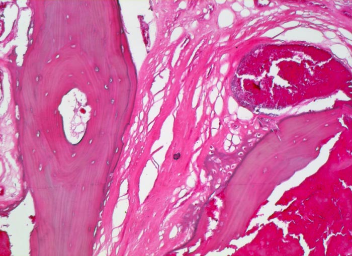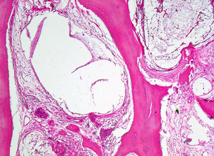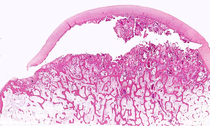 Ein Teil der nekrotischen Spongiosabälkchen dient als Leitschiene für die Neubildung von Osteoid und mineralisierten Trabekeln, die an der Aussenseite angelagert werden. In der Nekrosezone kommt es zur Sequestrierung von Knochenbälkchen durch Frakturen. Die Markräume werden bindegewebig organisiert. In der Peripherie besteht initial ein hyperämischer Randsaum und im Verlauf kommt es zur Ausbildung einer metaplastischen Knorpel- und Knochenneubildung mit Randsklerose. Das Endstadium der Abräumreaktion untergegangener Knochenabschnitte stellt eine meist subchondral lokalisierte pseudozystische Umwandlung dar. Schliesslich kollabiert der Femurkopf und der Verlust der Gelenkkongruenz führt zu einer fortschreitenden sekundären Coxarthrose ( 3192)