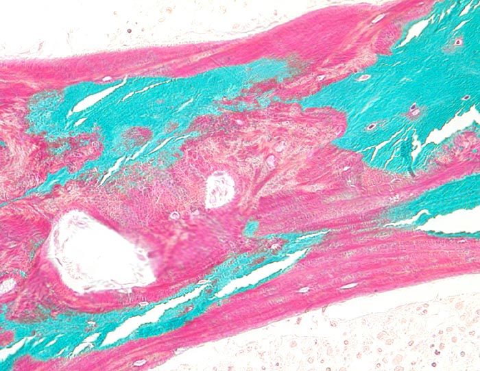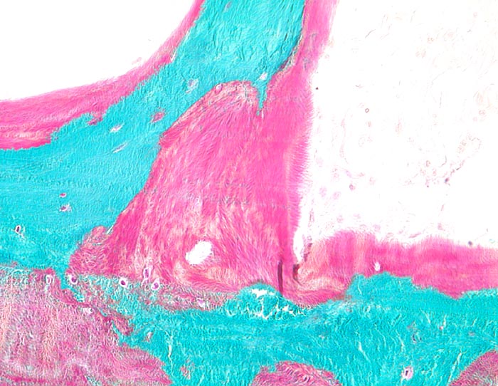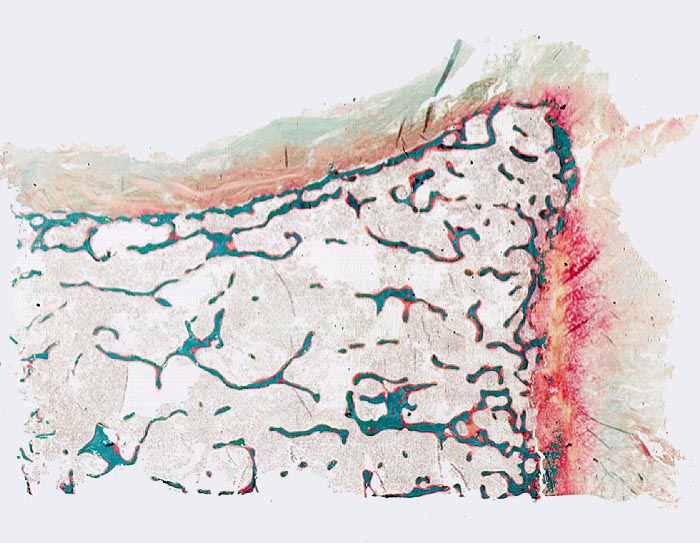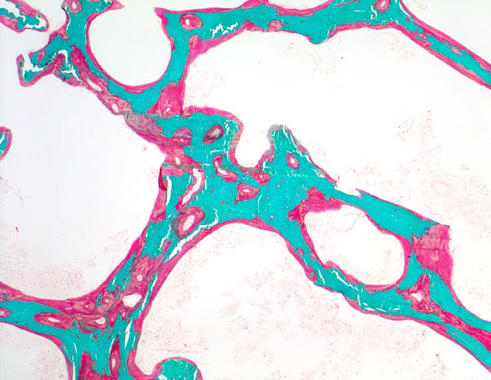 Bei Vitamin D Mangel ist das Gesamtvolumen sowie die Menge des Osteoids auf der Oberfläche der Spongiosabälkchen vermehrt (Volumen- bzw. Oberflächenosteoidose). Wechselt das Angebot an Vitamin D, kann unmineralisiertes Osteoid auch von mineralisierter Matrix eingeschlossen werden (= begrabenes Osteoid ( 3517)). Verbreiterte Osteoidsäume können neben der Osteomalazie (bzw. der Rachitis im Kindesalter) auch bei Hyperparathyreoidismus, bei einer fibrösen Dysplasie oder bei schnell wachsenden knochenbildenden Tumoren beobachtet werden. Insbesondere bei metabolischer Ursache sind die histologischen Veränderungen häufig kombiniert mit Veränderungen einer Fibroosteoklasie, bei der es zu oft tunnelierenden osteoklastären Resorptionen des Knochens und konsekutiver Auffüllung mit einem gut vaskularisierten bindegewebigen Stroma kommt. Die radiologisch nachweisbaren Looser-Umbauzonen (benannt nach dem Schweizer Chirurgen E. Looser) entsprechen Arealen unvollständig durchgebauter Fissuren/Frakturen mit nicht mineralisiertem Faserknochen. Durch eine Tetrazyklinmarkierung in zeitlich definiertem Abstand vor einer Knochenbiopsie kann die Mineralisationsdynamik abgeschätzt werden, da Tetrazykline bei der Mineralisation in den Knochen miteingebaut werden und im Fluoreszenzmikroskop identifiziert werden können.