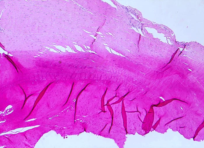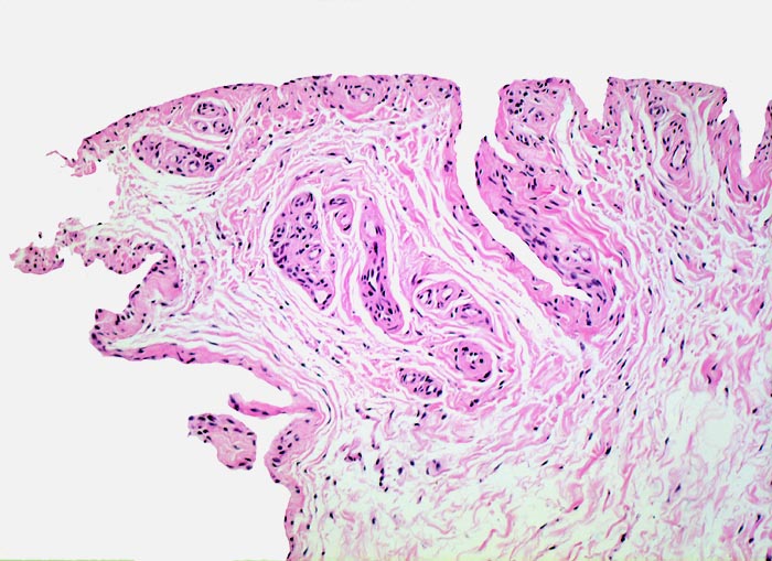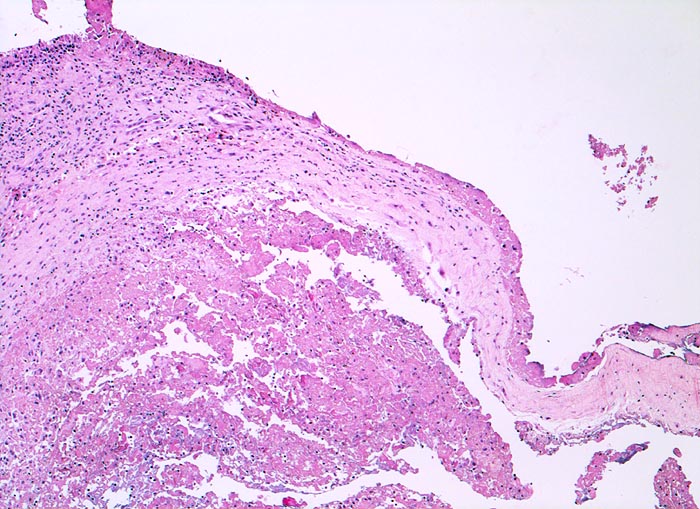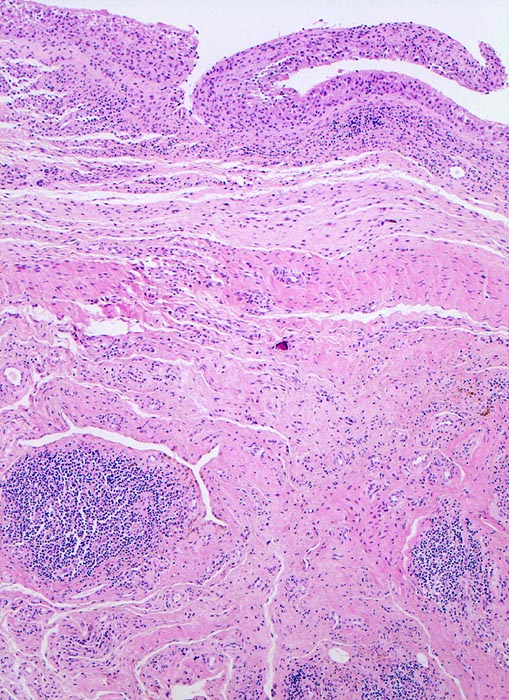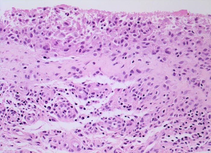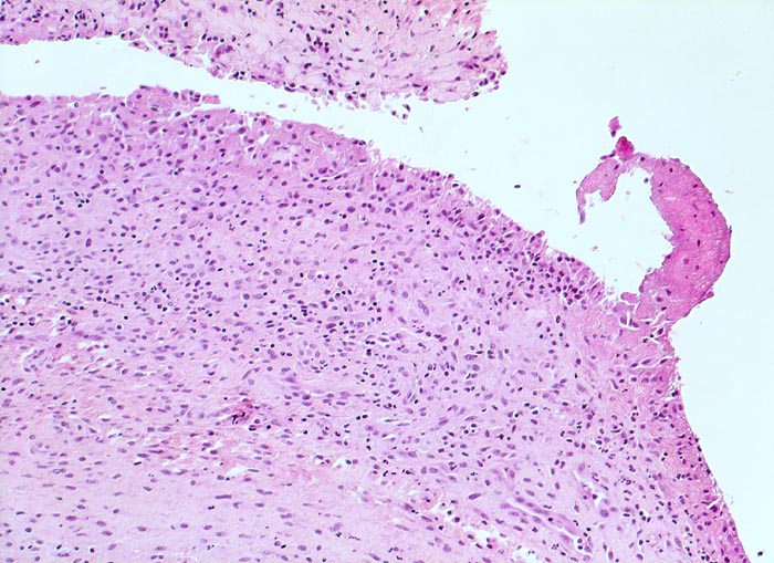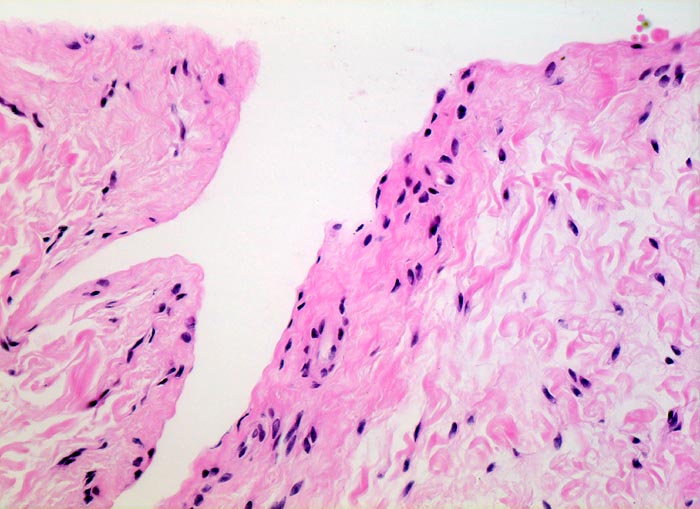 Typische histologische Veränderungen sind eine synoviale Zottenhyperplasie, Verbreiterung der Deckzellschicht unter Einschluss mehrkerniger Riesenzellen, Fibrinexsudate und synoviale Ulzerationen, Infiltrate von Lymphozyten teils in Form von Lymphfollikeln, Plasmazellen, neutrophilen Granulozyten, Makrophagen und Siderophagen, sowie Einschlüsse von Knorpel- und Knochenfragmenten (Detritussynovialitis). Die histologischen Befunde der Synovialis korrelieren oft nicht mit den klinischen Angaben. Trotz fortgeschrittener Gelenkdestruktion mit ausgeprägter klinischer Symptomatik können Synovialektomiepräparate nur sehr geringe pathologische Veränderungen zeigen. Oft ist auch nicht mehr zu eruieren, welche Läsionen Folge der Grundkrankheit und welche Folge diverser intraartikulärer Therapien oder begleitender Superinfektionen sind.