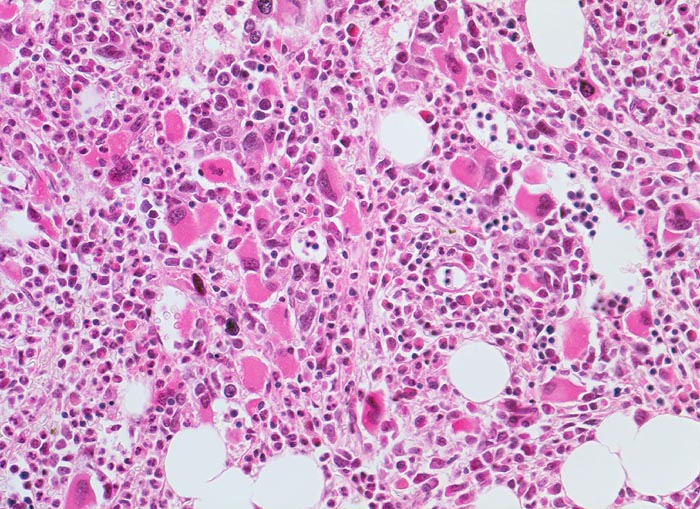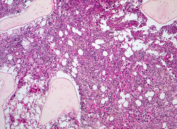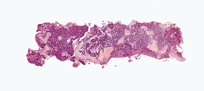 Die Erkrankung ist charakterisiert durch Knochenmarkfibrose, Hepato-Splenomegalie und extramedulläre Blutbildung. Diese findet sich am häufigsten in Leber und Milz, seltener in Lymphknoten, Nieren, Nebennieren, Dura mater, Gastrointestinaltrakt, Lunge, Mamma oder Haut. Blut und Knochenmark sind immer involviert. Die Krankheit entwickelt sich über ein initiales präfibrotisches Stadium mit hyperzellulärem Knochenmark zum fibrotischem Stadium (vorliegendes Präparat). Das fibrotische Stadium ist gekennzeichnet durch eine Vermehrung von Reticulin- und/oder Kollagenfasern und oft einer Knochenneubildung (=Osteomyelosklerose). Die Zellularität des Knochenmarks ist dann vermindert und dilatierte Marksinus enthalten intraluminale Blutbildungsherde. Es besteht eine auffallende Proliferation von Gruppen bildenden atypischen Megakaryozyten.
