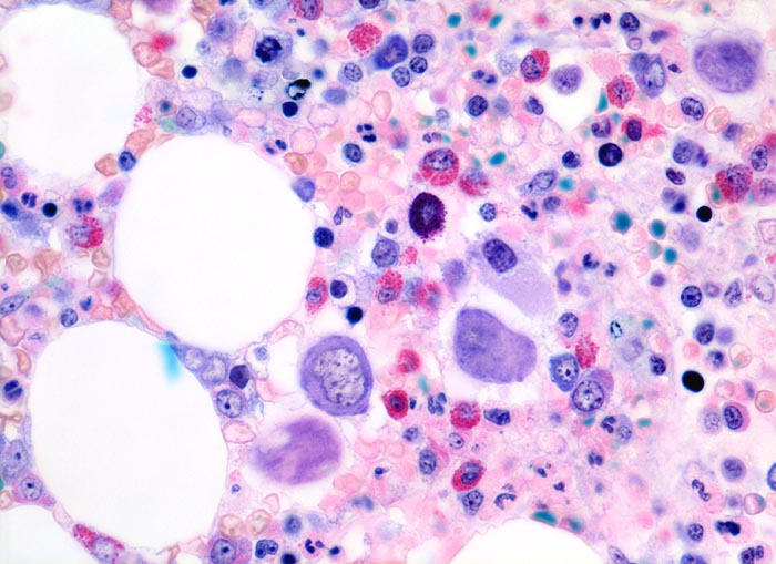- Vermehrung von atypischen, in Gruppen liegenden Megakaryozyten mit abnorm lobulierten Kernen.