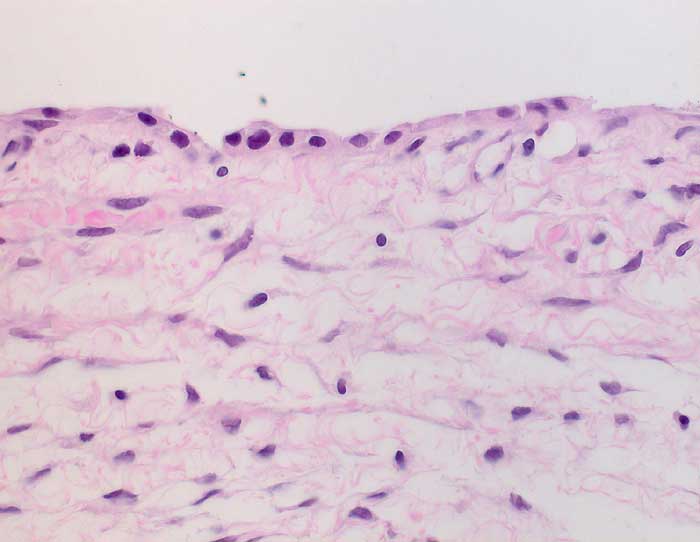 Der Ausstrich ist zellarm. Die Epithelien sind kubisch bis niedrig-zylindrisch und einzeln oder in flach ausgebreiteten Verbänden gelagert. Die Zellgrenzen sind weniger scharf als beim muzinösen Zystadenom. Die Kerne sind rund und das Chromatin ist fein granulär. Nukleolen sind klein oder fehlen. Das Zytoplasma enthält keinen Schleim und ist nicht vakuolisiert. Der apikale Zellrand trägt Zilien, was das seröse Zystadenom von Granulosazellen einer Follikelzyste unterscheidet. Die Zystenflüssigkeit enthält neben Epithelzellen Schaumzellen, Hämosiderin und ältere Blutbestandteile.