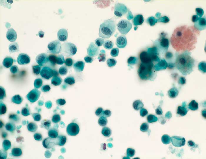 Die Zellen von serösen Zystadenomen, serösen Borderlinetumoren und serösen Karzinomen sehen sehr ähnlich aus. Sie unterscheiden sich lediglich durch eine graduelle Zunahme der Atypien, wobei der Borderlinetumor eine Zwischenstellung einnimmt. Die Epithelien sind kubisch bis niedrig zylindrisch und kommen einzeln oder in kleinen Verbänden vor. Gelegentlich bilden sie knospenförmige Proliferate, die in der Zystenflüssigkeit schwimmen. Die Kerne sind leicht vergrössert und polymorph. Einzelne Zellen können prominente Nukleolen enthalten.