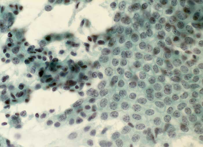 Abstriche aus dem Cavum Uteri und der Portio/Zervix-Abstrich, nicht aber die Spülzytologie zeigen einen typischen Exsudathintergrund mit frischen oder zerfallenden Erythrozyten, Fibrin, Zelldetritus und grossen Histiozyten. Im Portioabstrich erscheinen die Karzinomzellen meist einzeln oder in kleinen Gruppen und sind degenerativ verändert. Beim direkten Endometriumabstrich findet man zusammenhängende Zellhaufen, deren zytologischen Details wegen Überlagerungen oft nicht gut zu erkennen sind. Einzeln liegende Zellen kommen vor allem bei wenig differenzierten Karzinomen vor. Die Kerne sind etwa doppelt so gross wie normale Zylinderzellen. Die Chromatinkörnchen sind nie so grob wie beim Plattenepithelkarzinom. Kleine Nukleolen lassen sich meist nachweisen, Makronukleolen jedoch nur in 5% der Fälle. Anomalien der Kernmembran mit Kerben und Nasenbildung kommen vor allem beim wenig differenzierten Karzinom vor.