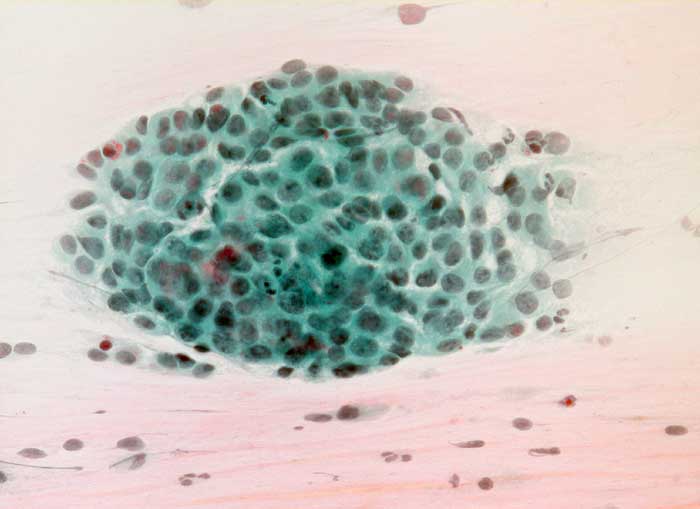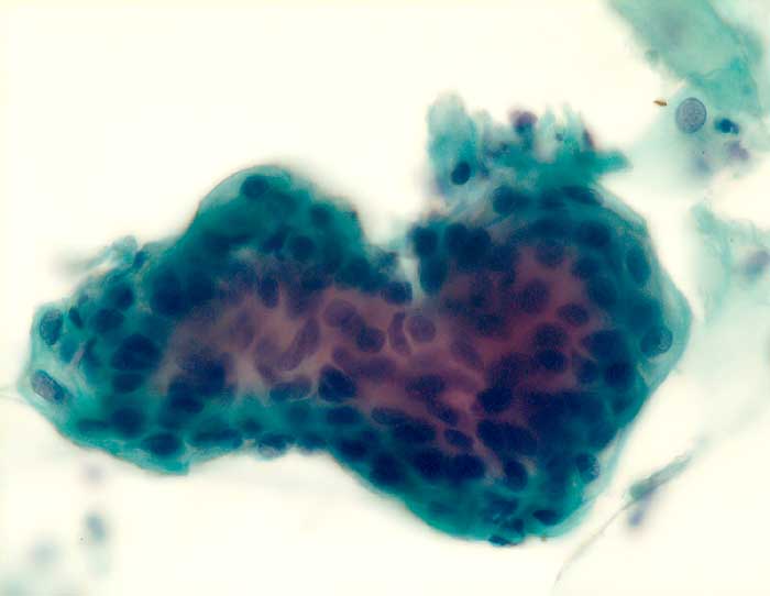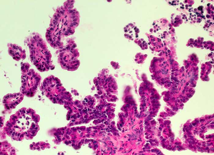 Die Zellkerne der serösen Adenokarzinome sind in den meisten Fällen hochgradig atypisch. Das Zellbild gleicht entsprechend demjenigen eines wenig differenzierten endometrioiden Adenokarzinoms. Da das seröse Karzinom anders als das endometrioide Karzinom nicht Folge eines Hyperöstrogenismus ist, zeigen die meist postmenopausalen Patientinnen keinen hohen Aufbau des Vaginalepithels im PC-Abstrich.