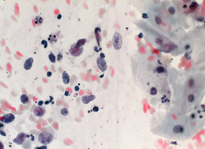 Maligne Lymphome der Zervix sind selten. Meist handelt es sich um die Manifestation eines generalisierten Lymphoms in der Zervix und nicht um ein primäres Zervixlymphom. Beim diffusen grosszelligen B-Zell Lymphom lassen sich einzeln liegende atypische blastäre Zellen nachweisen, die mindestens zweimal so gross sind wie kleine Lymphozyten. Die Kerne sind vesikulär und enthalten einen solitären zentralen oder mehrere periphere Nukleolen. Ausserdem sind Apoptosen, kleine Lymphozyten, Plasmazellen und Makrophagen zu sehen. Der Ausstrichhintergrund enthält oft Detritus.