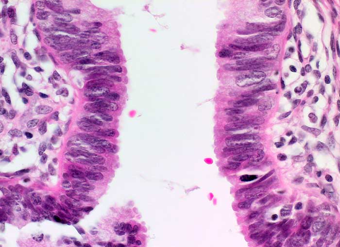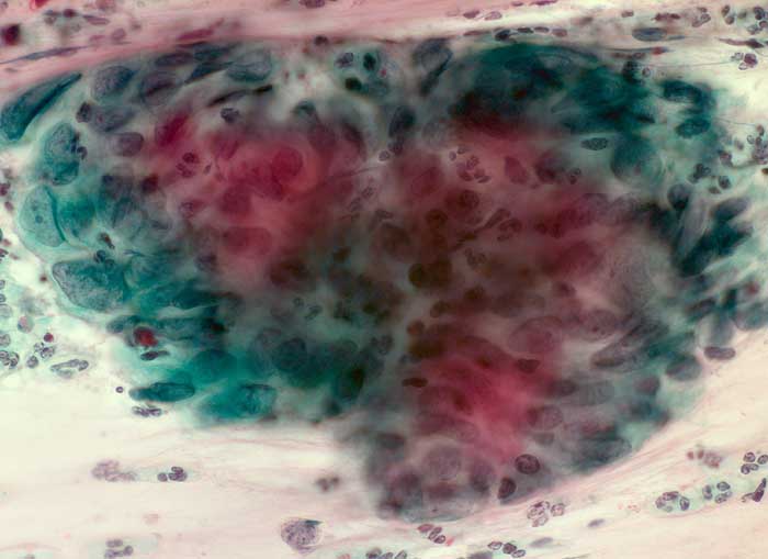 Die Ausstriche des ACIS sind zellreich und enthalten atypische Zylinderzellen mit grossen Kernen. Diese bilden flache Verbände, die in der Aufsicht ein Honigwabenmuster, bei seitlicher Betrachtung ein Palisadenmuster und eine Pseudostratifikation der Kerne erkennen lassen. Die Kerne sind im Vergleich zum normalen Zylinderepithel deutlich grösser und enthalten einen vergrösserten Nukleolus. Eine Hyperchromasie ist nicht immer vorhanden und das granuläre Chromatin ist regelmässig verteilt. Der zytologische Nachweis von atypischen Zylinderepithelien sollte histologisch weiter abgeklärt werden.
