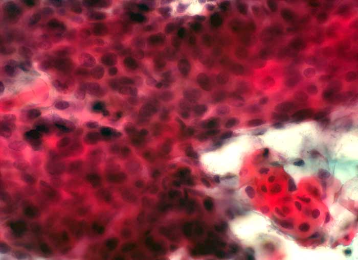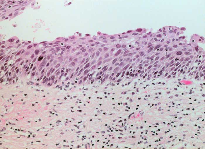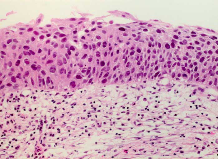 Die am wenigsten differenzierten Zellen der schweren Dysplasie entsprechen dem Basalzelltyp. Die Kerne sind grösser als bei der mässigen Dysplasie. Da die Zellen gleichzeitig kleiner sind, erhöht sich die Kern-Zytoplasma Relation deutlich zu Gunsten der Kerne. Die vergrösserten Chromatingranula sind durch bandförmige Chromatinverklumpungen miteinander verbunden. Dadurch entsteht ein typisches Siebmuster. Die Kernmembran ist unregelmässig verdickt und zeigt häufig auch tiefere Einkerbungen.