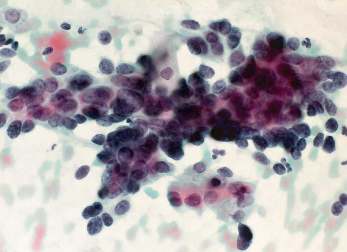 Das Carcinoma in situ wird in der Bethesda Klassifikation zusammen mit der mittelschweren und der schweren Dysplasie eingeteilt als high grade squamous intraepithelial lesion (HSIL). Im Vergleich zur schweren Dysplasie nehmen Grösse und Hyperchromasie der Kerne weiter zu. Die Zellgrösse entspricht dem Basalzelltyp. Das Chromatin ist grob verklumpt und unregelmässig verteilt. Der Kernhintergrund ist hell. Dadurch entsteht die an ein Leopardenfell erinnernde Kernstruktur. Grosse Nukleolen sind verdächtig auf eine bereits vorhandene Mikroinvasion (zweites Bildbeispiel). Zytologische und histologische Aufnahmen stammen von verschiedenen Patientinnen.