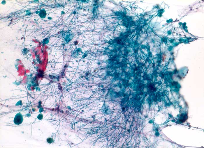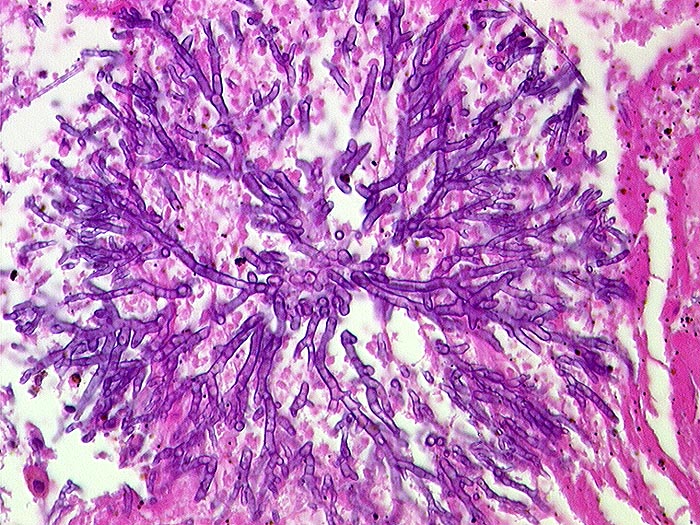 Aspergillen gehören in die Gruppe der Schimmelpilze und wachsen ubiquitär auf organischen Stoffen. Der Erreger ist charakterisiert durch echte septierte Hyphen von 3 bis 6 Mikrometer Durchmesser. Die Hyphen verzweigen sich in einem Winkel von 45 Grad. Selten sind auch die ( 10851)( 10849) Fruchtköpfe (Conidiophoren) nachweisbar. Aspergillusinfekte manifestieren sich je nach Resistenzlage als Aspergillom, invasive Aspergillose oder allergische Aspergillose. Der Nachweis von Aspergillus beweist noch nicht eine klinisch relevante Infektion.
