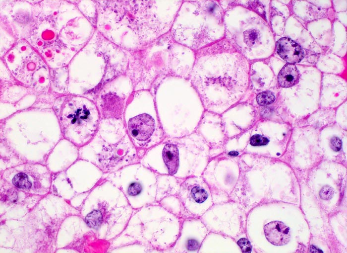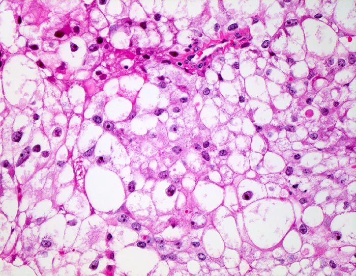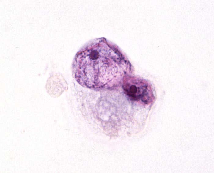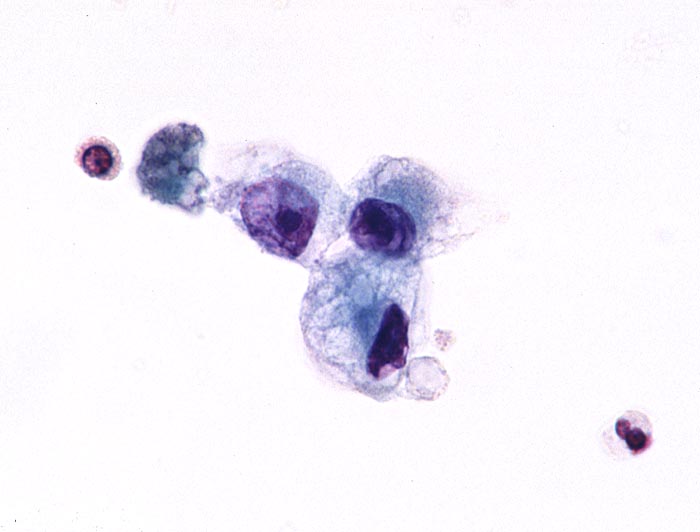 Typisch für das Nierenzellkarzinom sind relative grosse ein- oder mehrkernige atypische Zellen mit exzentrisch gelegenem Zellkern, plumpen Nukleolen und vakuolisiertem Zytoplasma. Der zytologische Nachweis wird dadurch erschwert, dass die Zellen auf ihrem Weg in die Harnblase degenerieren. Der Kern ist oftmals pyknotisch und das Zytoplasma in Auflösung und eosinophil granuliert. Differentialdiagnostisch muss an Tubulus- oder Sammelrohrepithelien gedacht werden.