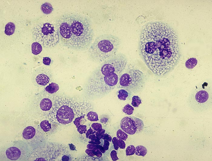 Bei der Sonderform der xanthogranulomatösen Pyelonephritis ist das Urinsediment oft stark hämorrhagisch und entzündlich verändert und kann Schaumzellen enthalten. Der erste Fall zeigt eine akute eitrige Pyelonephritis. Der zweite Fall eine xanthogranulomatöse Pyelonephritis.
