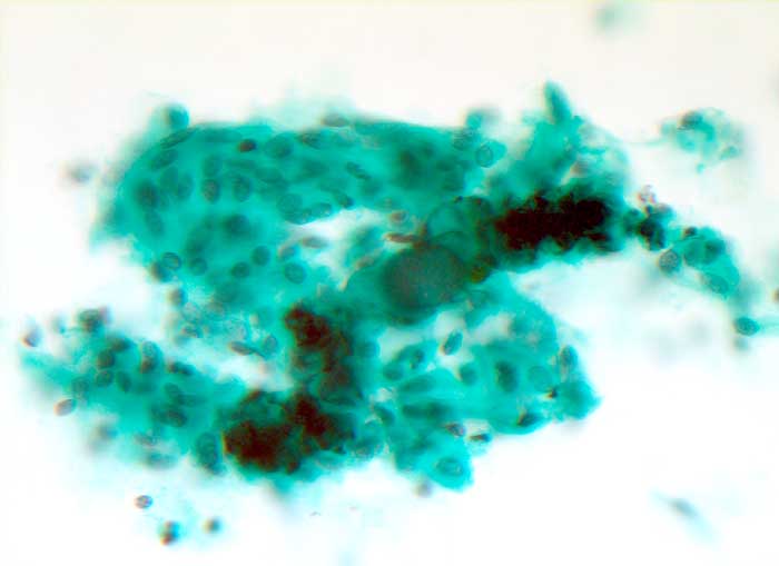 Abstriche und Waschflüssigkeit von Meningeomen sind meist auffallend zellreich. Die Zellen sind in pseudoepithelialen Verbänden gelagert. Charakteristisch sind Psammomkörperchen und zwiebelschalenartig geschichtete meningotheliale Zellkomplexe. Bei bestimmten Meningeomsubtypen sind diese Zellkomplexe jedoch nicht leicht auffindbar. Die Kerne enthalten gelegentlich intranukleäre Vakuolen. Die Zellen anaplastischer Meningeome sind stärker dissoziiert, die Kerne sind hyperchromatisch und pleomorph, Mitosen sind vermehrt.
