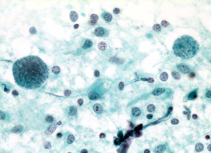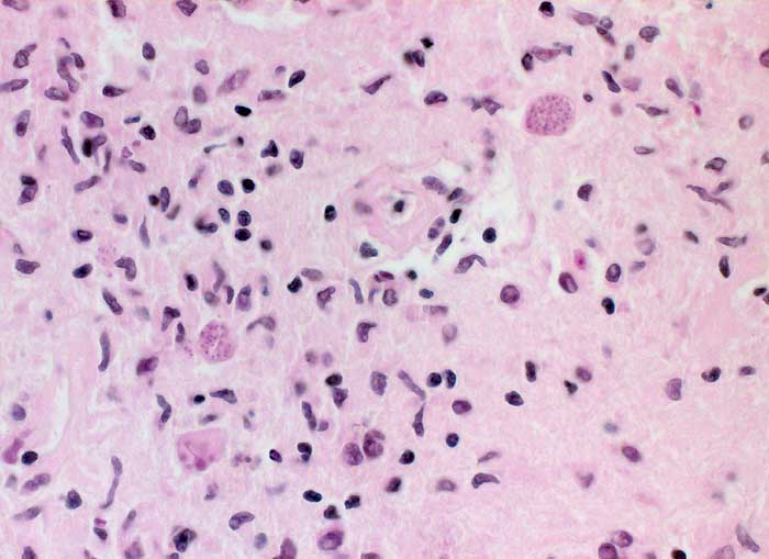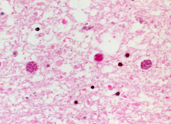 Abstriche von infiziertem Hirngewebe zeigen kleine Gruppen degenerierter glialer Zellen und Histiozyten.