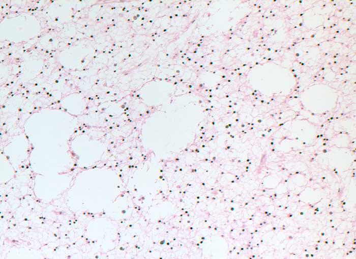 Die Waschflüssigkeit ist eher zellarm. Die Ausstriche erscheinen sauber. Den Hintergrund bildet eine feinfasrige Matrix vermischt mit Nervenzellen, normalen und reaktiven Gliazellen. Die astrozytären Tumorzellen sitzen typischerweise Kapillarachsen auf. Endothelhyperplasie und Kapillarproliferate sind im Ausstrich gut zu sehen. Das Zytoplasma ist unscharf und bildet feine fasrige Fortsätze. Die Tumorzellkerne sind rund bis oval oder angedeutet spindelig, das Chromatin feingranulär. Zellgrösse, Polymorphie und Kernatypie nehmen mit abnehmender Differenzierung zu.