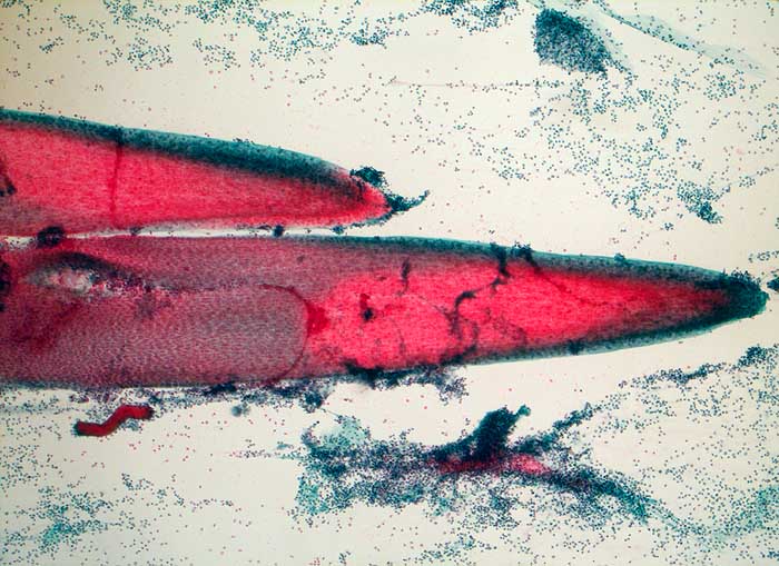 Eine offene Verbindung zwischen Bronchialsystem oder Ösophagus und Pleuraraum kann entstehen als Folge von nekrotisch zerfallenden Tumoren, einschmelzenden Lungeninfarkten, Lungenabszessen oder tuberkulösen Kavernen. Zytologisch entspricht der Befund einem Empyem. Zusätzlich enthalten die Ausstriche Plattenepithelien der Mundhöhle bzw. des Ösophagus oder Flimmerzellen. Das erste Bild zeigt eine bronchopleurale Fistel. Die folgenden Bilder Speisepartikel im Pleuraraum bei ösophagopleuraler Fistel.
