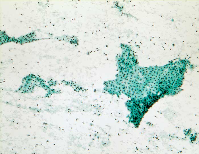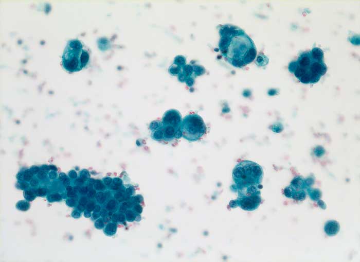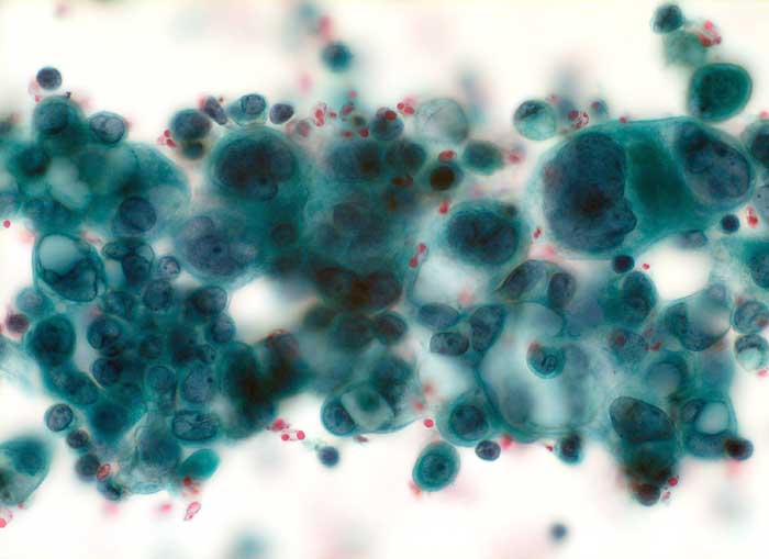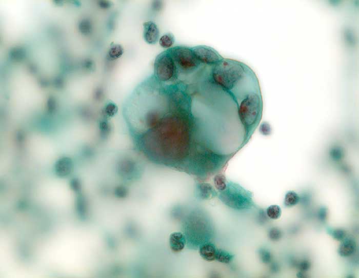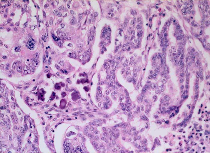 Beim serösen Zystadenokarzinom des Ovars findet man oft scheinbar zwei Tumorzellpopulationen (Dimorphismus). Das heisst, die Karzinome sind heterogen aufgebaut und weisen nebeneinander einige grosse vakuolisierte Zellen und kleinere kubische Zellen im gleichen Zellverband auf. Sehr typisch, aber nicht beweisend für einen serös papillären Tumor ist der Nachweis von Psammomkörperchen.