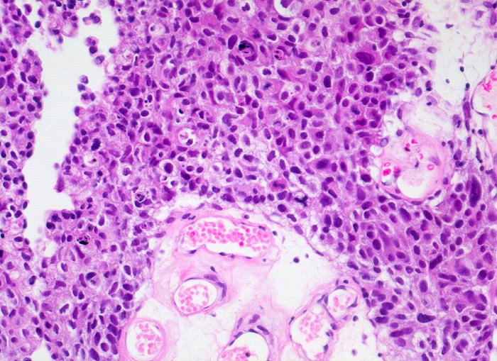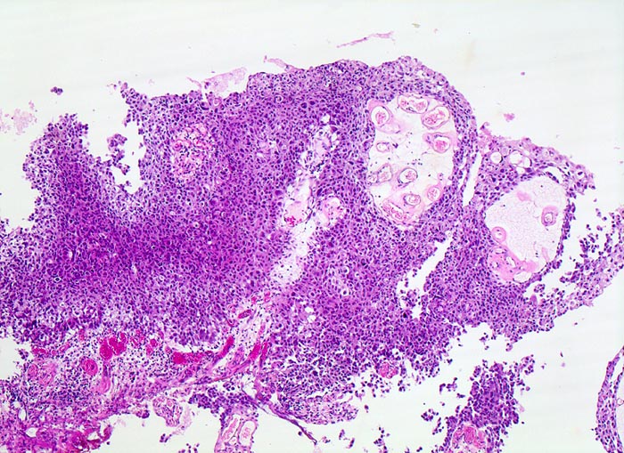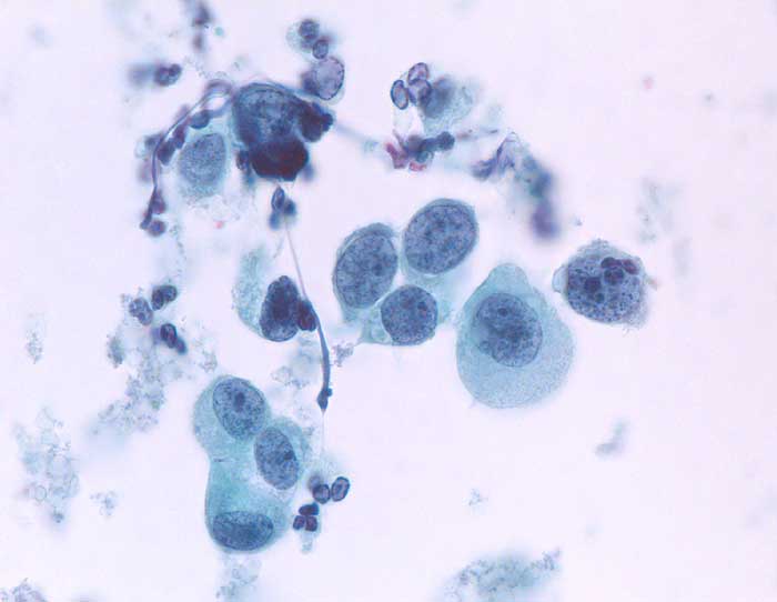 Das Urinsediment ist wie bei den meisten papillären Tumoren zellreich. Die Atypien sind auf den ersten Blick zu sehen. Die Tumorzellen sind deutlich grösser als Basal- und Parabasalzellen. Die Kerne sind polymorph, hyperchromatisch und sehr grob strukturiert. Sie können den lavabrockenähnlichen Kernen des Plattenepithelkarzinoms gleichen. Die Kernmembran ist oft gebuchtet oder grob gebuckelt. Büschel von hochgradig atypischen zylindrischen Urothelien weisen auf die papilläre Struktur des Tumors hin. Blut und Detritus bilden den Ausstrichhintergrund.