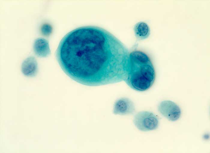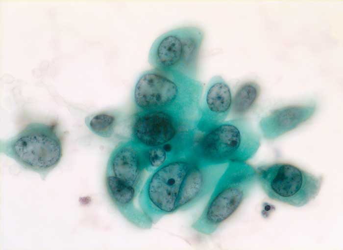 Bronchiale Adenokarzinome unterscheiden sich kaum von Adenokarzinomen anderer Primärlokalisation. Die Kerne sind vesikulär und rundlich. Die Kernmembran ist oft fein gekerbt. Die Kernhyperchromasie ist meist weniger ausgeprägt und die Chromatingranula sind weniger grob als beim Plattenepithelkarzinom oder beim kleinzelligen Karzinom. Die Kerne enthalten einen oder mehrere prominente Nukleolen. Das Zytoplasma kann Vakuolen mit oder ohne Schleim enthalten. Die Tumorzellen liegen in dreidimensionalen Verbänden, lockeren Haufen oder einzeln. Die verschiedenen Varianten des Adenokarzinoms lassen sich zytologisch nicht eindeutig unterscheiden. Je nach Differenzierungsgrad kann auch die Abgrenzung von einem Plattenepithelkarzinom oder einem grosszelligen Karzinom unmöglich sein. In solchen Fällen empfiehlt es sich, ein nicht kleinzelliges Karzinom zu diagnostizieren.