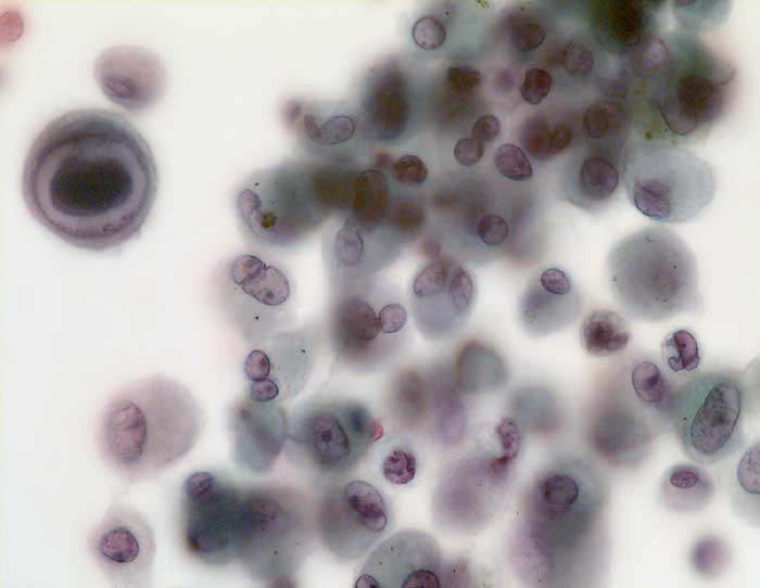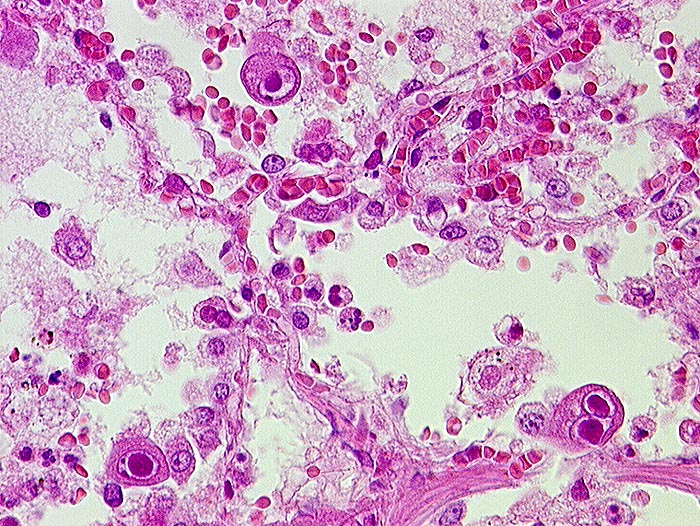 Das Zytomegalievirus befällt Makrophagen und Endothelzellen von immunsupprimierten Patienten. Die virusbefallenen Zellen sind deutlich vergrössert und enthalten einen grossen intranukleären Einschlusskörper, der sich durch einen schmalen hellen Zytoplasmasaum von der Kernmembran abhebt (Eulenaugenzellen). Die bis zu 1 Mikrometer grossen zytoplasmatischen Einschlusskörper konzentrieren sich meist im paranukleären Zytoplasma. Der Ausstrichhintergrund in der BAL ist oft sauber, da aufgrund der Immunsuppression eine entzündliche Reaktion fehlt.