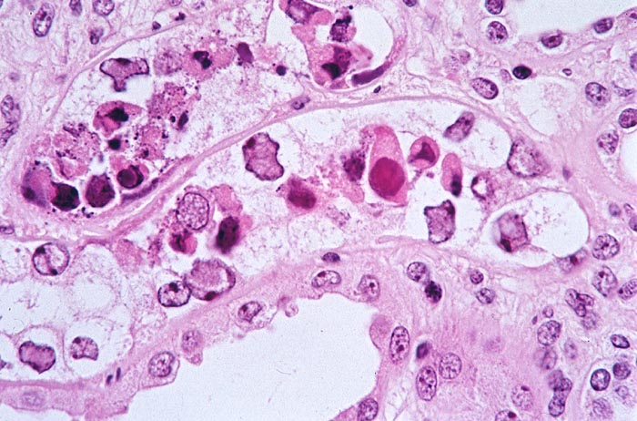 Die Typen BK und JC des Polyomavirus sind für den Menschen pathogen. Das JC Virus verursacht die progressive multifokale Leukenzephalopathie. Das BK Virus persistiert in der Niere, ohne eine manifeste Erkrankung hervorzurufen. Bei Immunsupprimierten kann es zu einer klinisch manifesten Infektion der Nieren kommen. Nukleäre Viruseinschlusskörper finden sich in solchen Fällen im Epithel der Sammelrohre und im Epithel anderer Tubulusabschnitte und im Urothel von Nierenbecken und Ureter. Gehäuft tritt der Niereninfekt unter Immunsuppression mit Tacrolimus auf. Die Urinzytologie stellt die einfachste Nachweismethode dar. Die Polyomavirus-infizierten Decoy-Zellen (=Lockvogelzellen wegen Verwechslungsmöglichkeit mit atypischen Zellen) enthalten einen milchglasartigen Kern. Das Chromatin ist grobschollig und and die Kernmembran gedrängt. Bei drohender Transplantatabstossung ist zusätzlich die Zahl der tubulären Zellen im Urin deutlich erhöht.