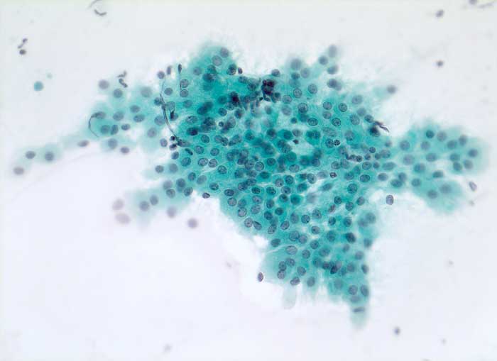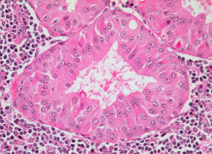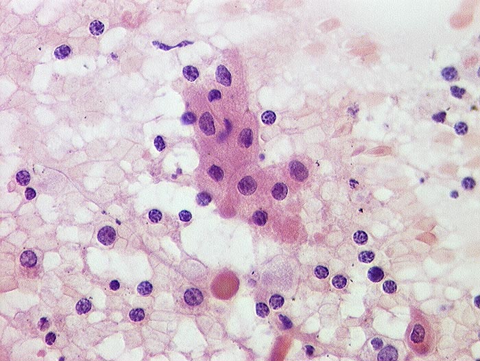 Der Warthin Tumor ist ein zystisch papillärer Tumor mit lymphoidem Stroma und einem zweischichtigen onkozytären Epithel. Schleim- oder Becherzellen und metaplastisches Plattenepithel können vorkommen. Die diagnostischen Zellen werden oftmals verdünnt durch den Zysteninhalt, was in einer falsch negativen Punktion resultieren kann. Im Idealfall enthält das Punktat Onkozyten und Lymphozyten auf granulär zystischem Hintergrund. Oftmals fehlen aber die Onkozyten. Differentialdiagnostisch muss man in solchen Fällen an eine lymphoepitheliale (oder branchiogene) Zyste denken. Onkozyten kommen bei einer Vielzahl anderer Parotisläsionen vor: onkozytäre Metaplasie oder Hyperplasie, Sjögren Syndrom, Onkozytom, Mucoepidermoidkarzinom, Adenokarzinom, adenoidzystisches Karzinom.