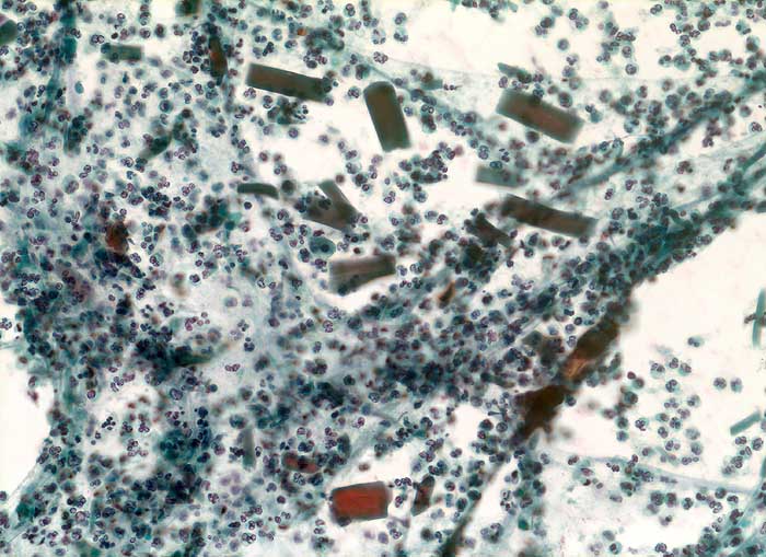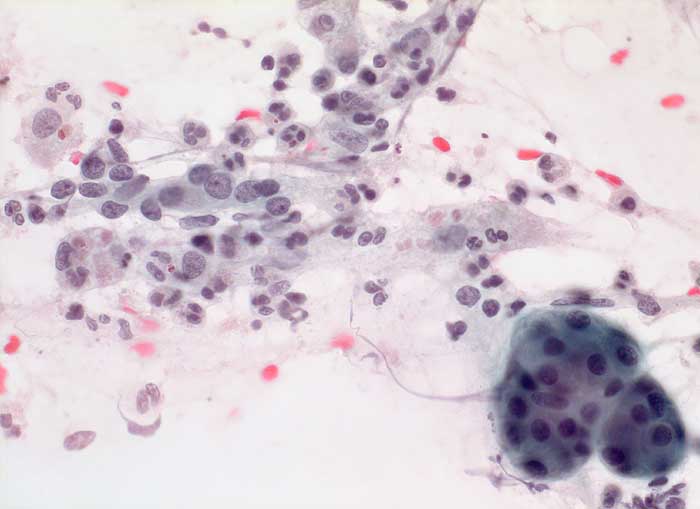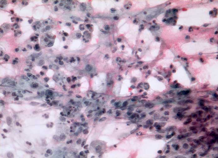 Akute bakterielle Sialadenitiden werden oft verursacht durch eine Gangobstruktion (z.B. Steine), können aber auch bei schlechter Mundhygiene oder bei Immunsupression vorkommen. Die Feinnadelpunktion kann durch eine Druckverminderung zu einer Schmerzreduktion führen. Das Punktat gleicht einem Abszess mit neutrophilen Granulozyten, Fibrin und Nekrosen. Gelegentlich sind Erreger nachweisbar. Zu einem späteren Zeitpunkt kommen Lymphozyten, Plasmazellen, Makrophagen, Granulationsgewebe und Epithelien mit regenerativen Veränderung/Atypien zur Darstellung.
