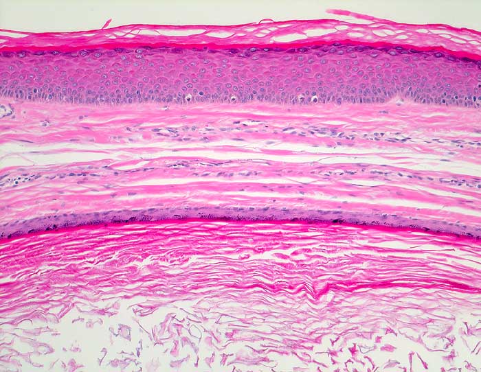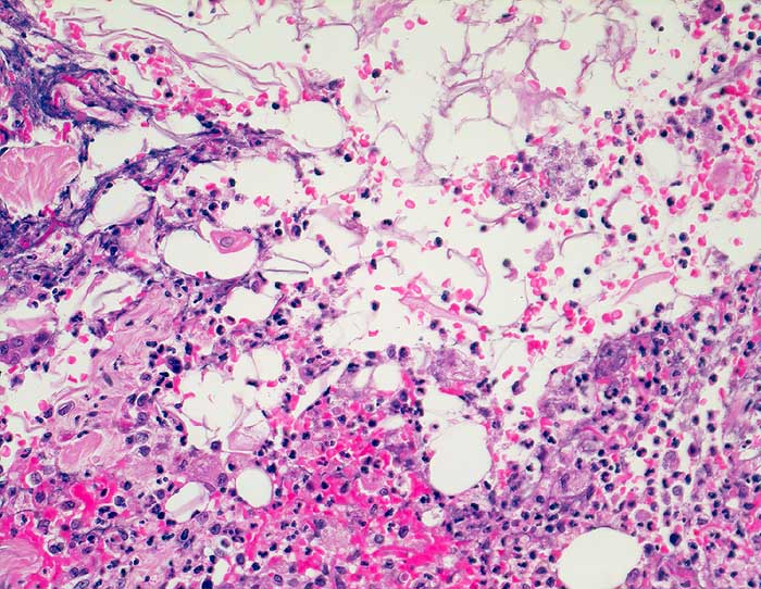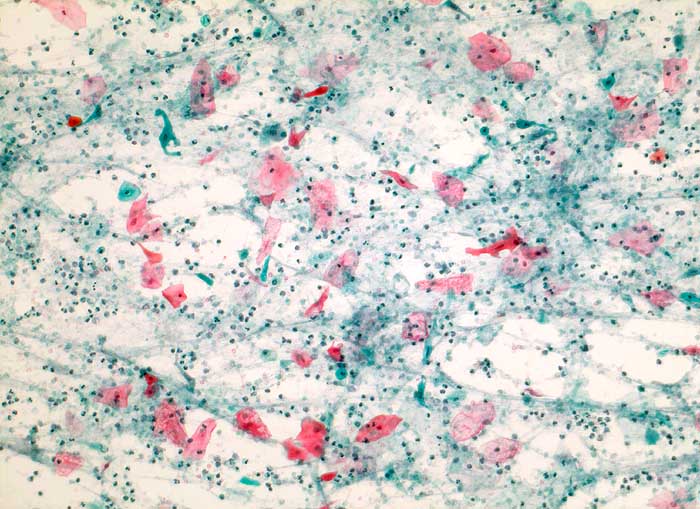 Epidermal ausgekleidete Zysten (Atherome) werden oft punktiert. Pathognomonisch sind dichte Zusammenballungen von kernlosen gelb gefärbten Hornschuppen. Nach einer Zystenruptur ist der Hintergrund detritisch und enthält wie bei einem Abszess zahlreiche neutrophile Granulozyten und Schaumzellen. Die Hornschuppen werden oft von Fremdkörperriesenzellen und Histiozyten umlagert. Nekrotische Lymphknotenmetastasen von hochdifferenzierten Plattenepithelkarzinomen können ähnlich aussehen. Die Plattenepithelzellen des Karzinoms sind aber oft bizarr geformt und weisen atypische Kerne auf.