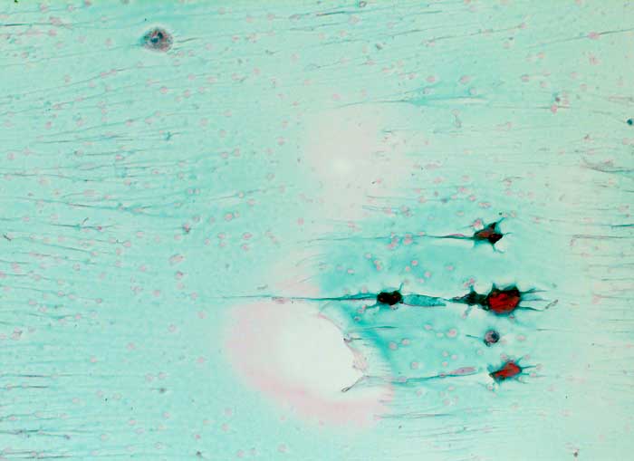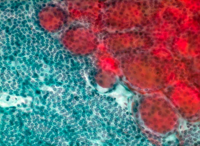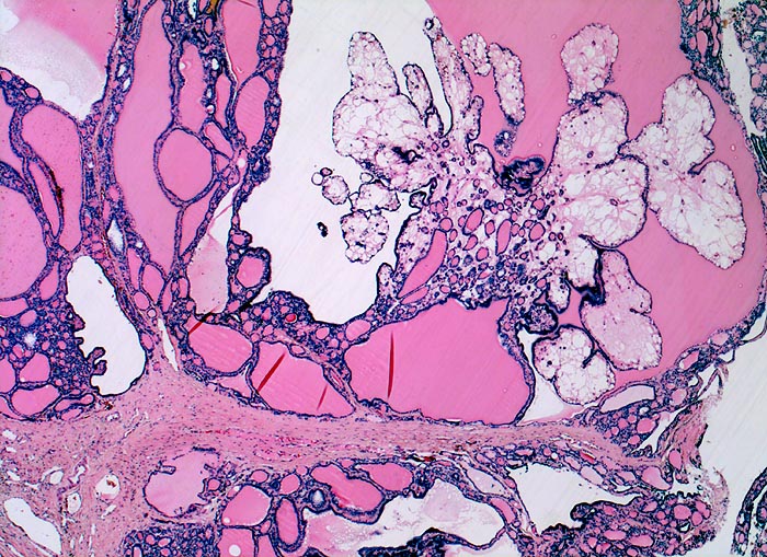Grosse Kolloidmengen, ein regelmässiges honigwabenartiges Muster flächenhafter Zellverbände und grosse Follikel sind die mikroskopischen Merkmale eines gutartigen Strumaknotens.