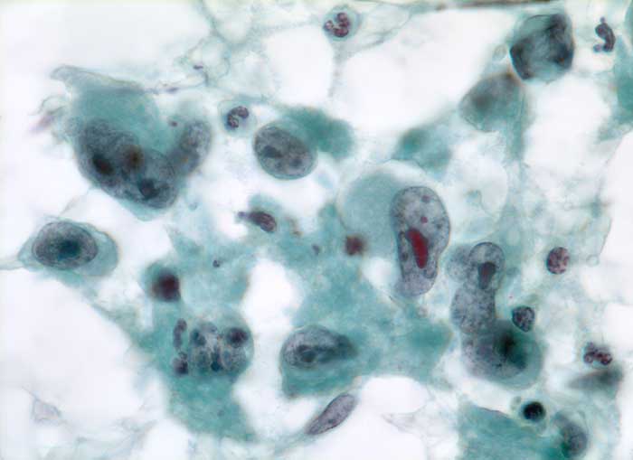 Abstriche von anaplastischen Karzinomen sind gewöhnlich sehr zellreich ausser bei ausgeprägter Desmoplasie. Die Grösse und die Form der Tumorzellen ist äusserst variabel. Oft finden sich sehr grosse, bizarre und spindelförmige Zellen. Die Kerne weisen offensichtliche Zeichen der Malignität auf: irreguläre Kernmembran, grobes dunkles Chromatin und Makronukleolen. Mitosen, auch atypische, sind häufig. Das Zytoplasma variiert von blass und vakuolisiert über granulär bis dicht. Nekrosen, neutrophile Granulozyten und eine Tumordiathese im Hintergrund sind typisch. Die Tumoren exprimieren Vimentin und Zytokeratine, sind aber negativ für Thyreoglobulin und TTF1 (Thyroid Transcription Factor).