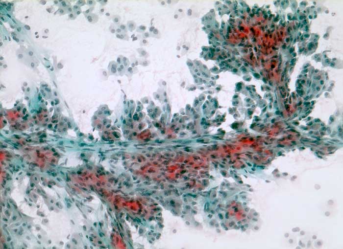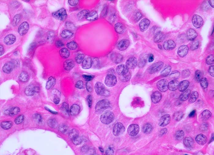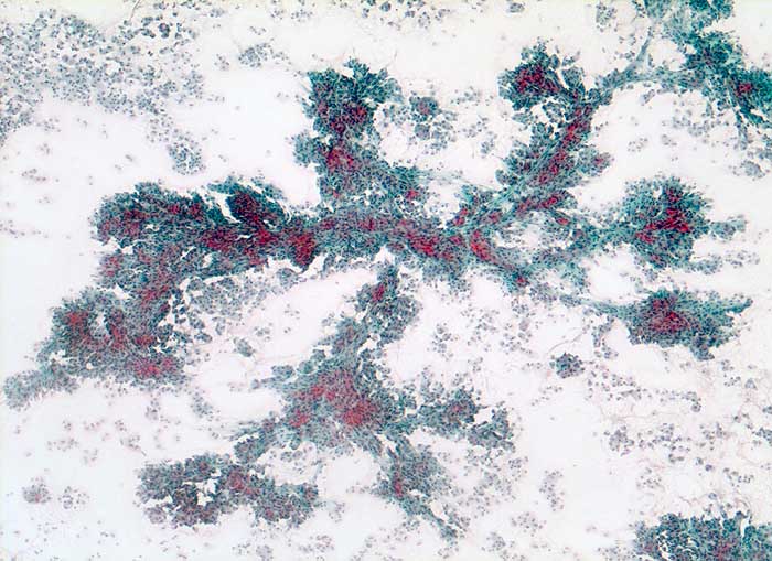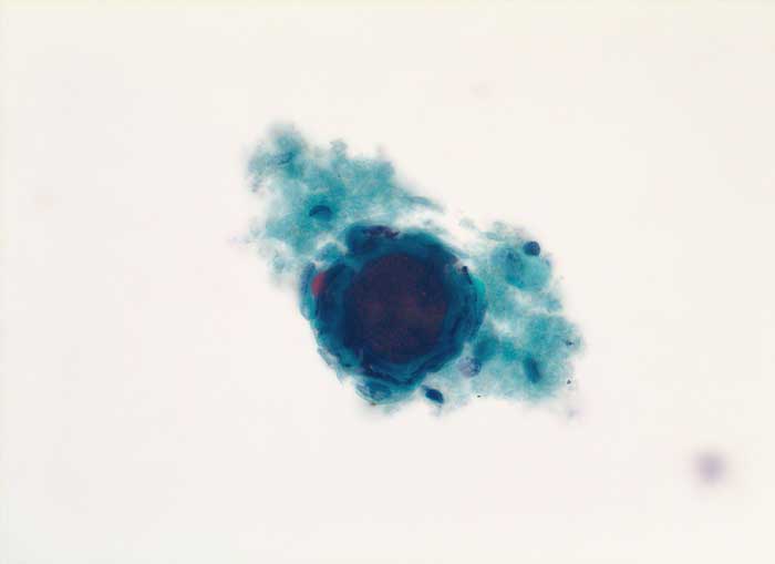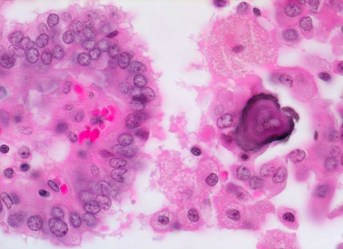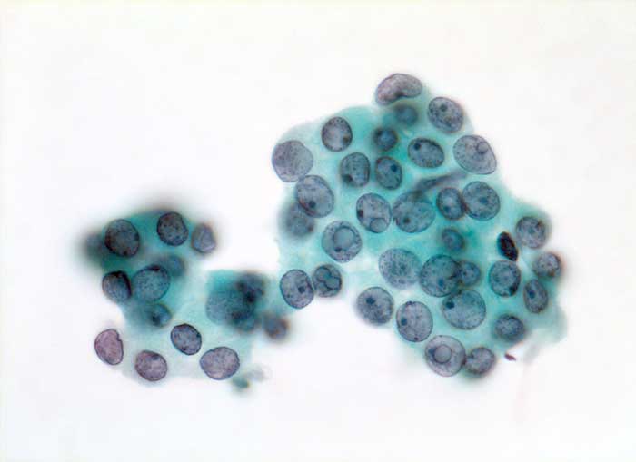 Die zytologischen Ausstriche sind meist zellreich und enthalten grosse einschichtige Zelltapeten in regelmässiger honigwabenartiger Anordnung. Dreidimensionale verzweigte Papillen mit fibrovaskulären Stromastielen finden sich lediglich in 10-60% der Fälle. Follikuläre Strukturen sind in bis zu 85% der Fälle zu sehen. Der Hintergrund ist oft zystisch mit Schaumzellen und mehrkernigen Riesenzellen. Gelegentlich lassen sich Psammomkörperchen nachweisen. Sehr wichtig für die Diagnose sind folgende Kernkriterien: leicht vergrösserte uniforme Kerne, unregelmässige Kernmembran, Kernkerben (grooves), intranukleäre Zytoplasmainvaginationen und prominenter eosinophiler Nukleolus.