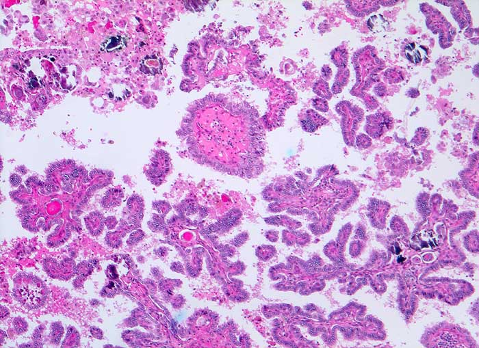 Klassisches diagnostisches Merkmal papillärer Schilddrüsenkarzinome sind fingerartige Papillen mit einem fibrovaskulären Stiel. Echte Papillen sind hochcharakteristisch aber gleichwohl nicht pathognomonisch für das papilläre Karzinom. Man findet sie auch bei Schilddrüsenhyperplasie, bei Thyreoiditis und in medullären Schilddrüsenkarzinomen. Ein Teil der papillären Schilddrüsenkarzinome zeigt überdies ein überwiegend follikuläres Wachstumsmuster. Die Diagnose des papillären Karzinoms wird dann aufgrund der typischen Kernmorphologie gestellt.