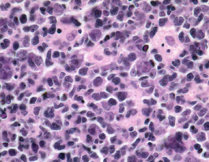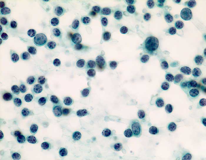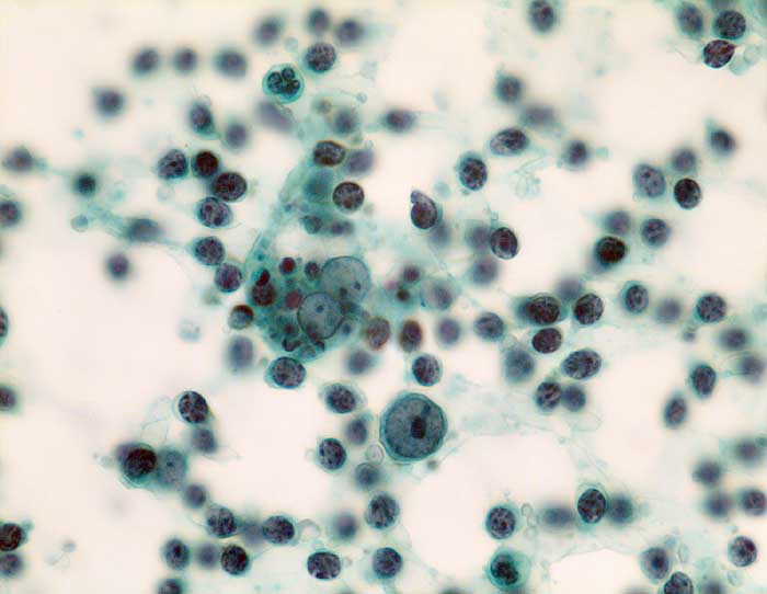 Ein buntes Zellbild ist typisch für die reaktive hyperplastische Lymphadenitis. Neben kleinen Lymphozyten sind viele Zentrozyten und Zentroblasten aus aktivierten Keimzentren, sowie Kerntrümmermakrophagen nachweisbar. Letztere beweisen keinesfalls die Gutartigkeit der Veränderung. Daneben findet man auch neutrophile Granulozyten und Plasmazellen.