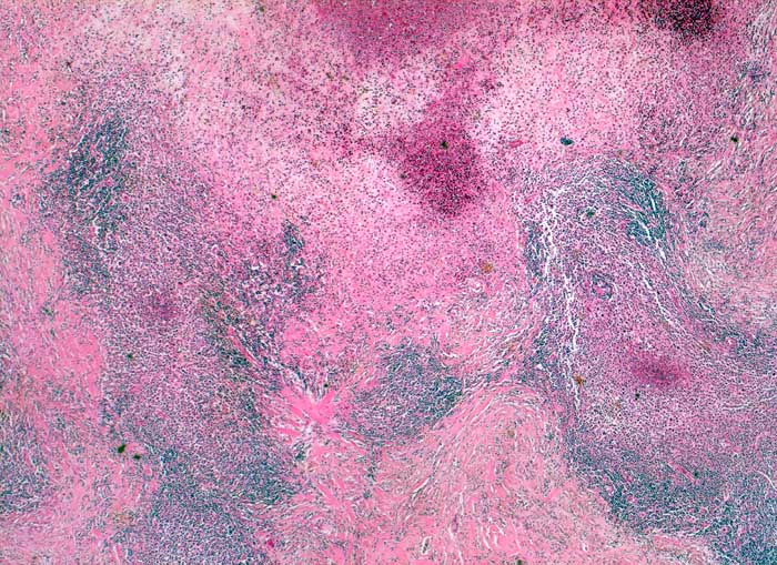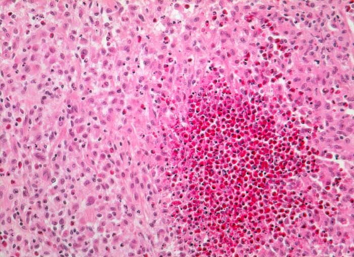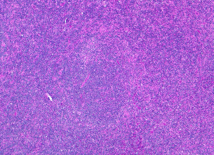 Das Zellbild ist bunt und umfasst Lymphozyten, Plasmazellen, eosinophile Granulozyten und einzeln im reaktiven Infiltrat liegende Tumorzellen.