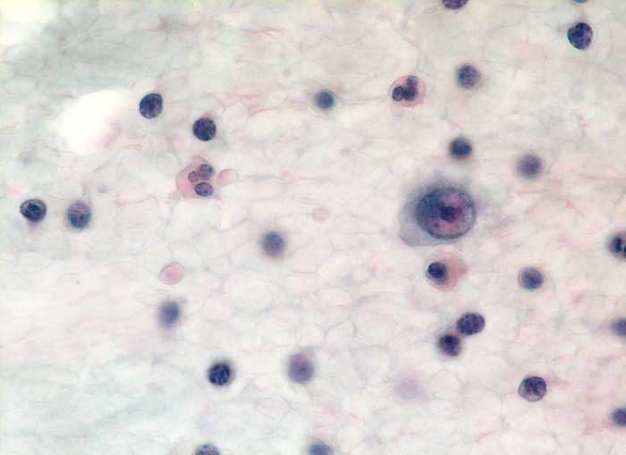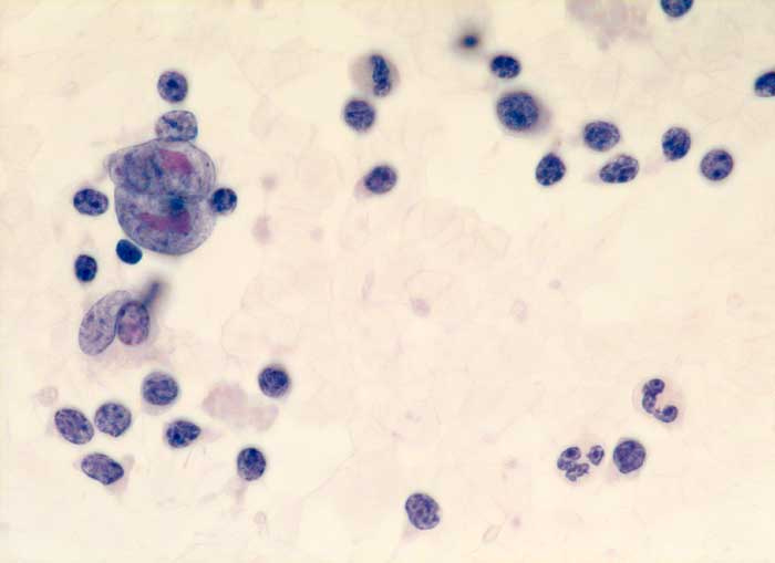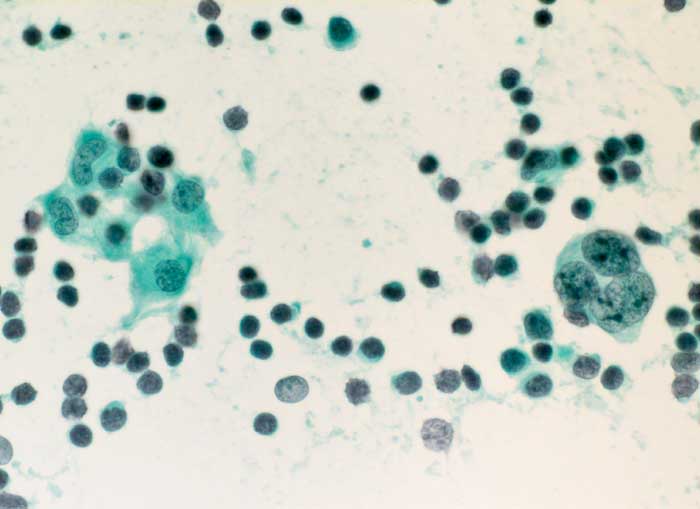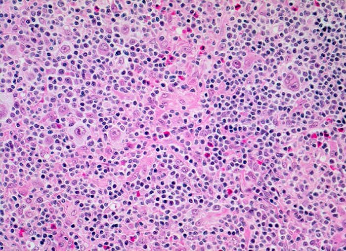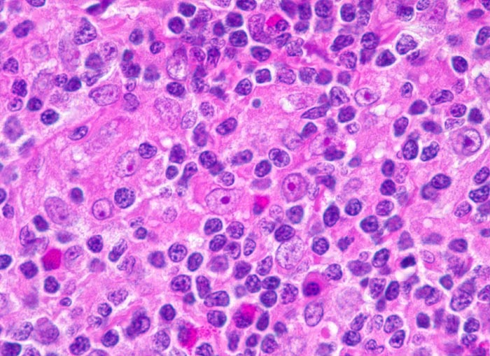 Die Tumorzellen sind einkernig (Hodgkin Zelle) oder mehrkernig (Reed-Sternbergzellen) und enthalten einen sehr grossen Nukleolus. Die Tumorzellen sind immunzytochemisch positiv für CD15 und CD30. Nodulär sklerosierender und gemischtzelliger Subtyp des Hodgkin Lymphoms sind zytologisch nicht sicher zu unterscheiden.